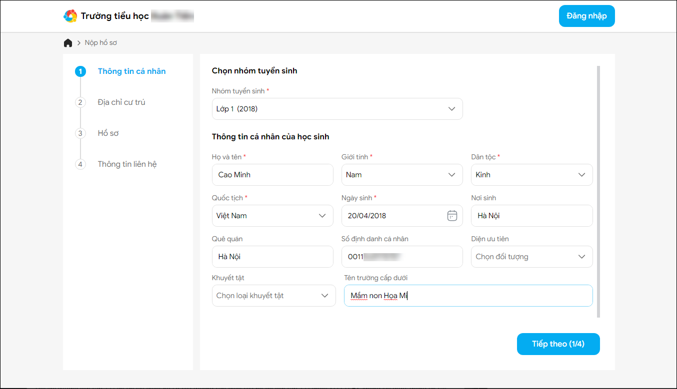 - Thông tin cá nhân: Chọn nhóm tuyển sinh muốn nộp hồ sơ cho con (Nếu nhà trường có nhiều nhóm tuyển sinh). Nhập thông tin cá nhân của con.