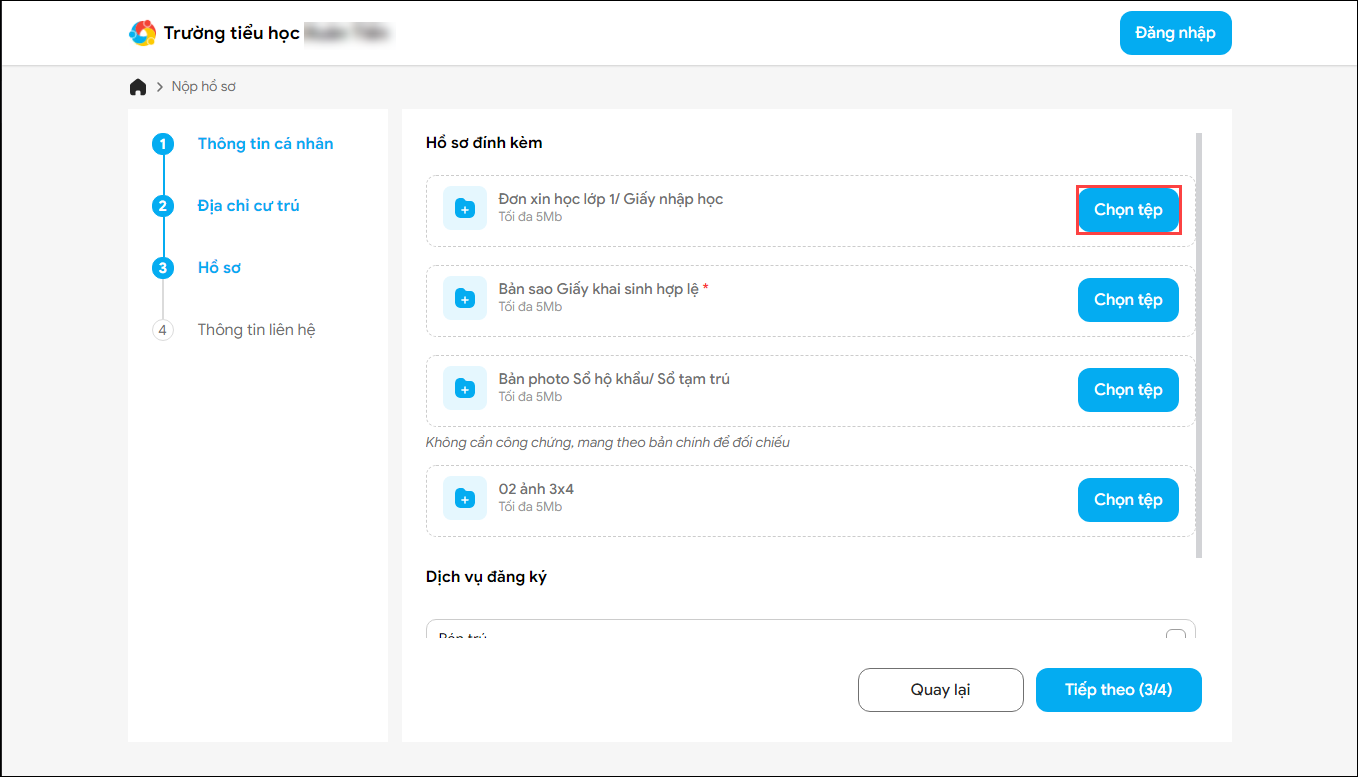 - Hồ sơ: Đính kèm các tài liệu, giấy tờ, hình ảnh theo yêu cầu của nhà trường. Nhấn Chọn tệp và tải file từ máy tính/điện thoại của phụ huynh.