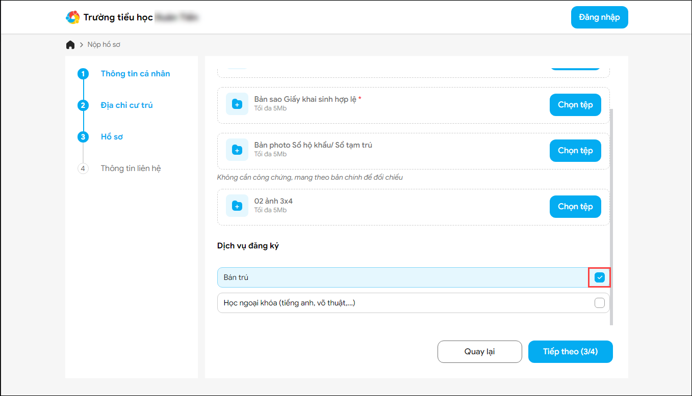 Lưu ý: Phụ huynh có thể tích chọn để đăng ký luôn các dịch vụ nếu nhà trường mở sẵn các dịch vụ (Học ngoại khóa; đồng phục; sách giáo khoa;…)