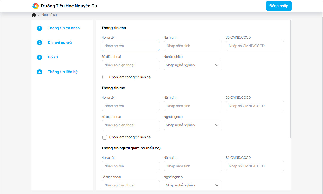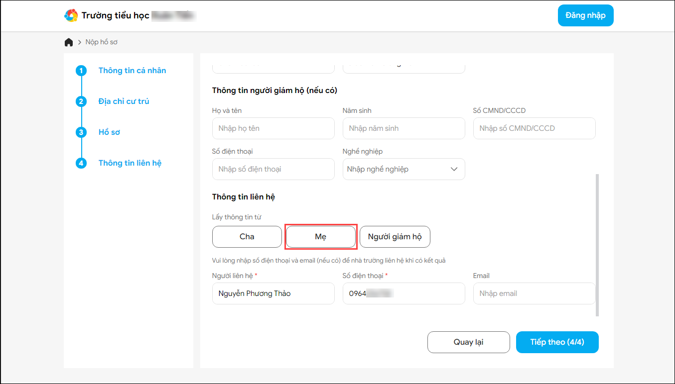 - Thông tin liên hệ: Khai báo thông tin cha; thông tin mẹ; thông tin người giám hộ (nếu có).