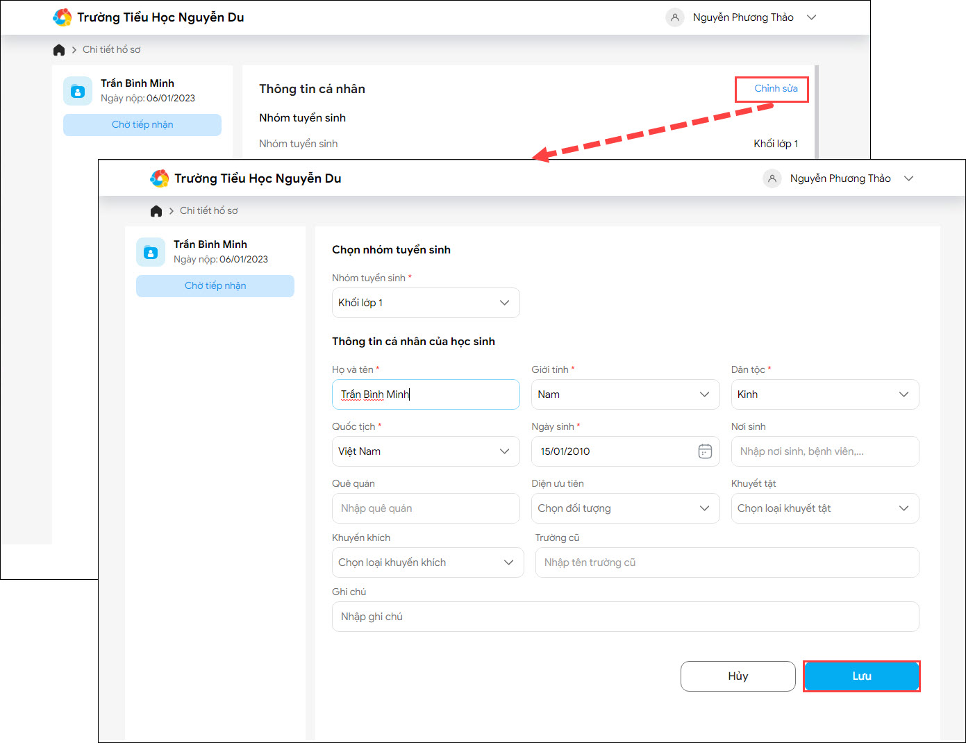 - Hoặc hồ sơ sau khi sơ loại được nhà trường yêu cầu bổ sung thông tin, phụ huynh có thể chỉnh sửa theo hướng dẫn sau: