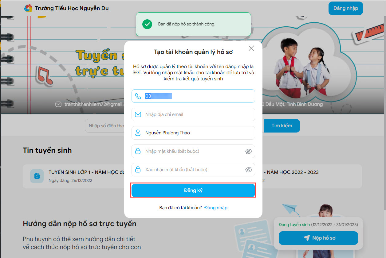 - Hệ thống ghi nhận nộp hồ sơ thành công. Để phục vụ công tác quản lý hồ sơ, tra cứu kết quả tuyển sinh cho con, phụ huynh vui lòng đăng ký tài khoản theo số điện thoại đã khai báo tại mục Thông tin liên lạc.