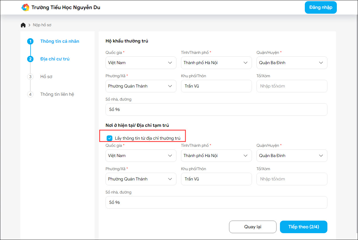 - Địa chỉ cư trú: Khai báo thông tin địa chỉ trên hộ khẩu thường trú và nơi ở hiện tại. (Để không mất công nhập lại thông tin địa nếu nơi ở hiện tại trùng với hộ khẩu, tích chọn Lấy thông tin từ địa chỉ thường trú)