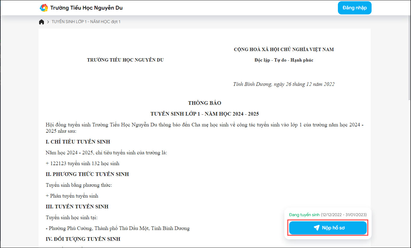 - Phụ huynh có thể nộp hồ sơ đăng ký trực tuyến cho con nếu đợt tuyển sinh ở trạng thái Đang tuyển sinh bằng cách chọn Nộp hồ sơ.