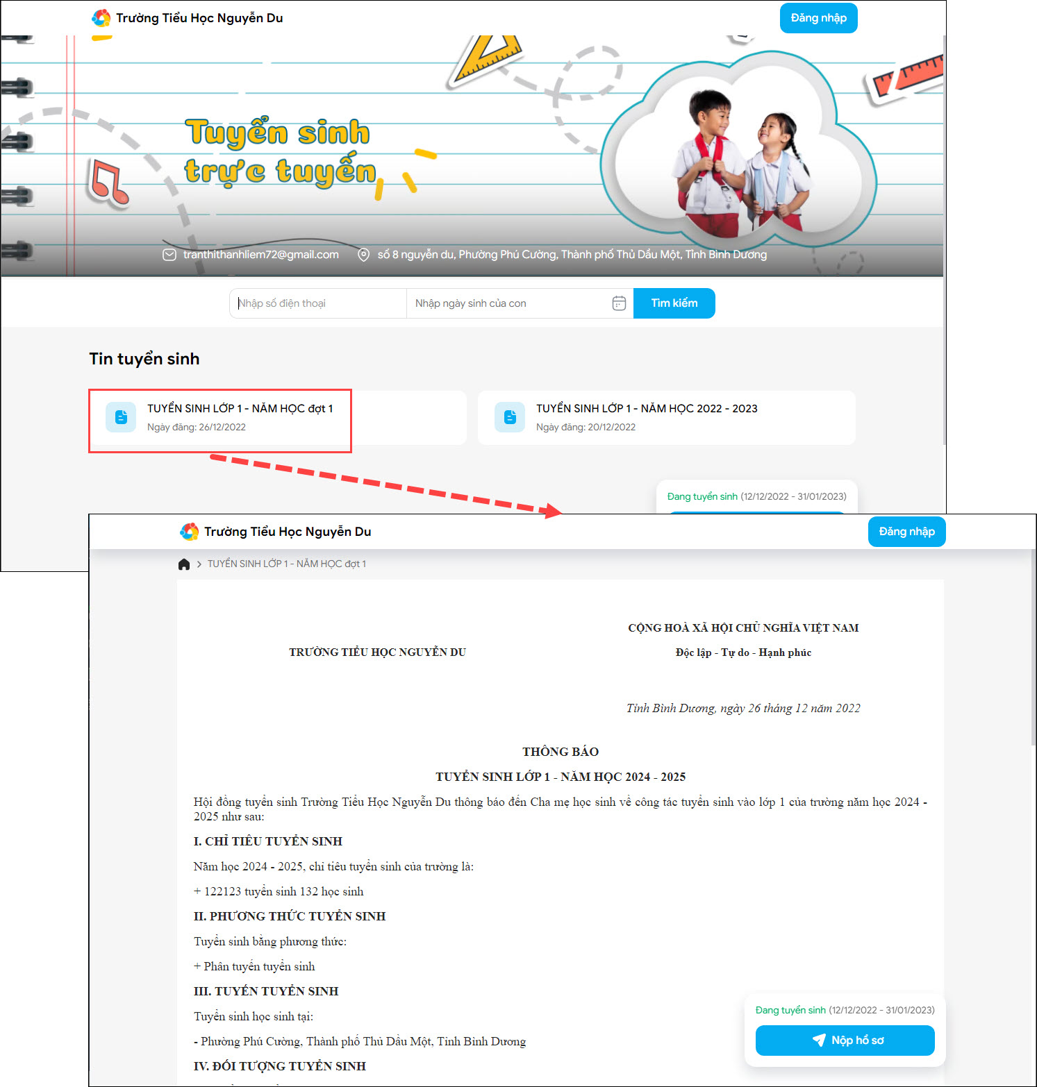 - Sau khi truy cập vào cổng thông tin tuyển sinh của trường mà phụ huynh muốn nộp hồ sơ cho con, anh/chị theo dõi được đầy đủ thông tin chi tiết, quy định, thông báo tuyển sinh của nhà trường.