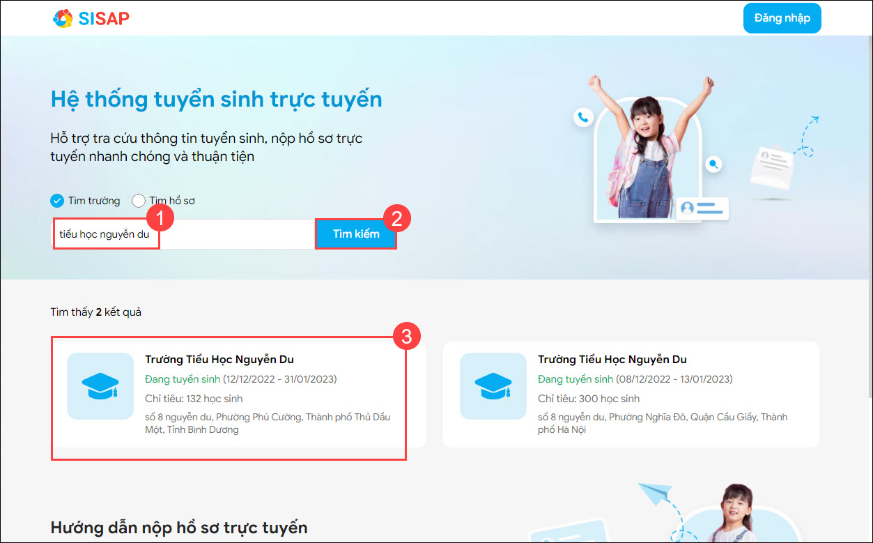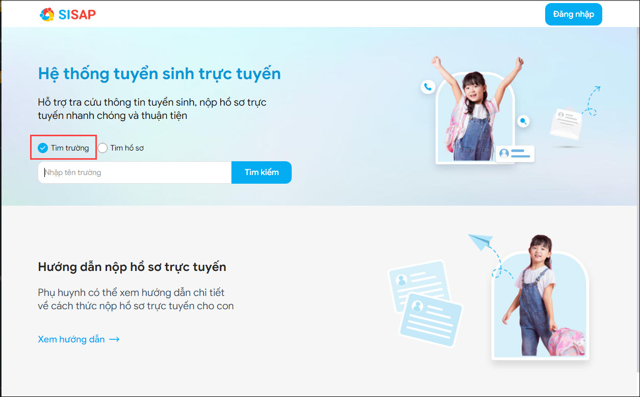 - Trường hợp truy cập từ cổng tuyển sinh chung của Phòng Giáo dục, phụ huynh cần tìm kiếm trường.