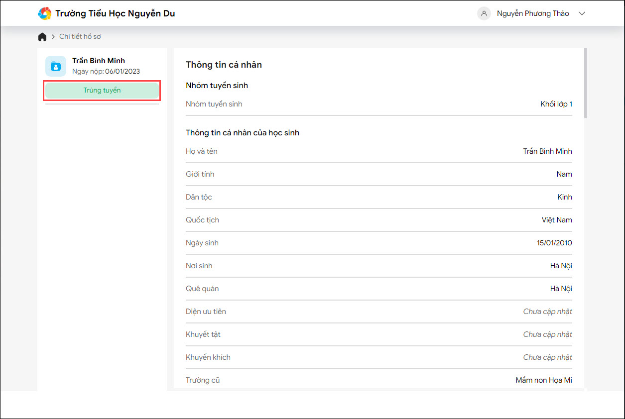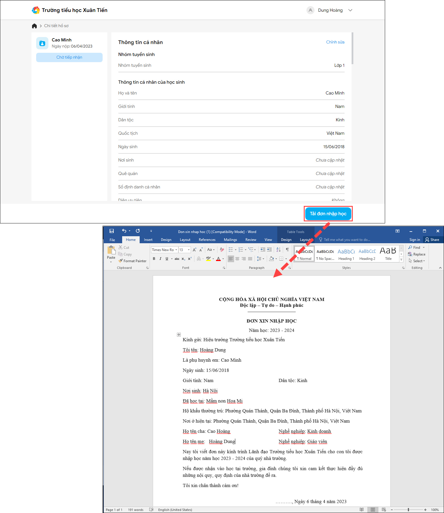 - Trường hợp học sinh Đã trúng tuyển và cần hoàn tất hồ sơ nộp nhà trường, phụ huynh có thể Tải đơn nhập học có sẵn thông tin đã khai báo trên hồ sơ mà không cần nhập lại theo hướng dẫn chi tiết tại đây.