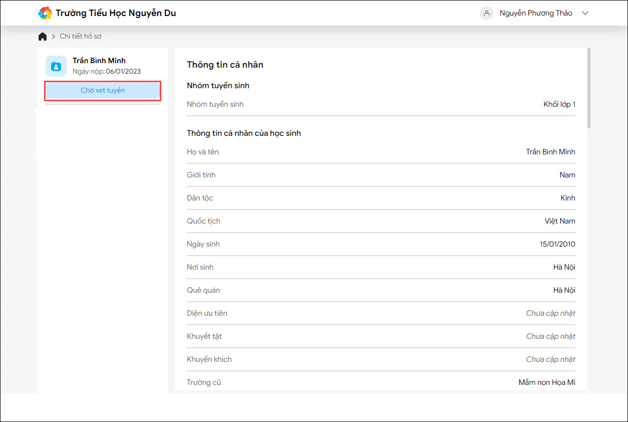 - Chờ tiếp nhận: Hồ sơ đã được nộp cho nhà trường, đang chờ hội đồng tuyển sinh sơ loại, kiểm tra thông tin, giấy tờ.