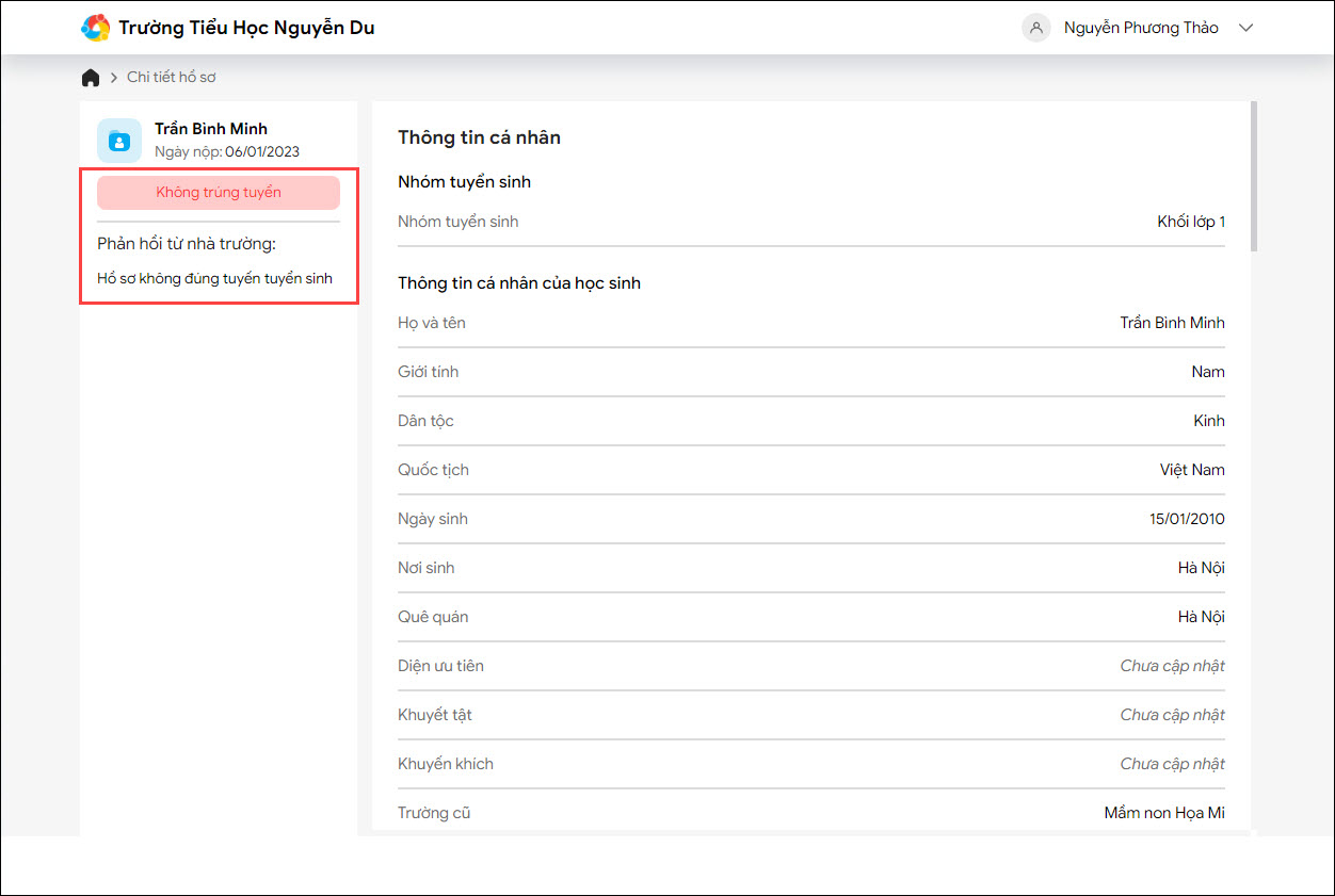 - Không trúng tuyển: Hồ sơ sau khi xét tuyển không đạt tiêu chí, không đủ điều kiện theo học tại trường.