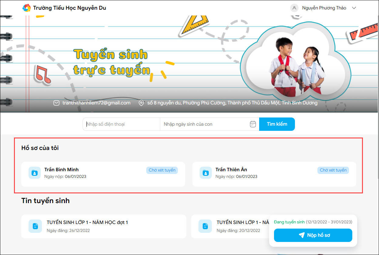 - Sau khi đăng nhập thành công, phụ huynh có thể thấy tất cả hồ sơ tuyển sinh đã nộp tại mục Hồ sơ của tôi.