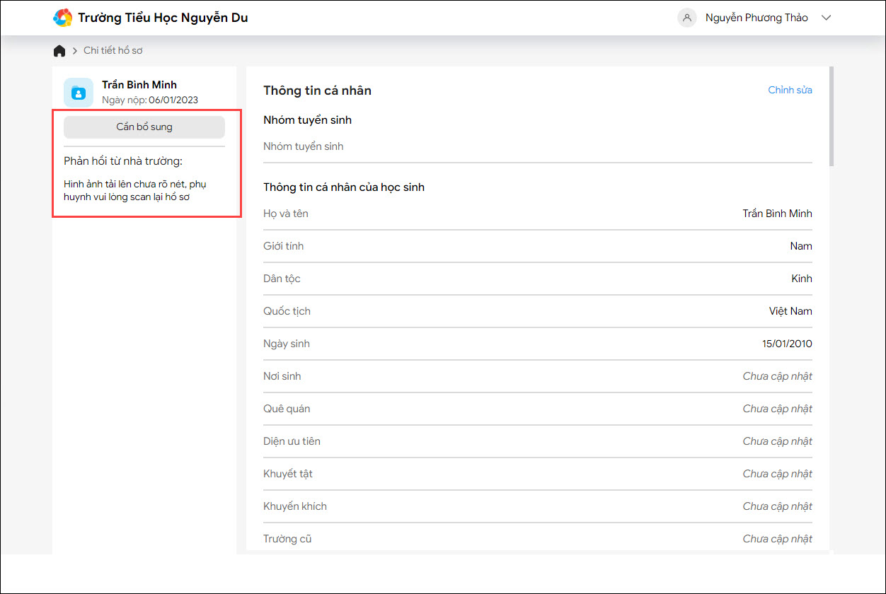 (Lưu ý: Khi hồ sơ ở trạng thái Chờ tiếp nhận, phụ huynh có thể bổ sung/chỉnh sửa hồ sơ nếu muốn theo hướng dẫn chi tiết tại đây) - Cần bổ sung: Hồ sơ cần cập nhật lại, phụ huynh bổ sung giấy tờ còn thiếu theo phản hồi của nhà trường sau khi sơ loại.