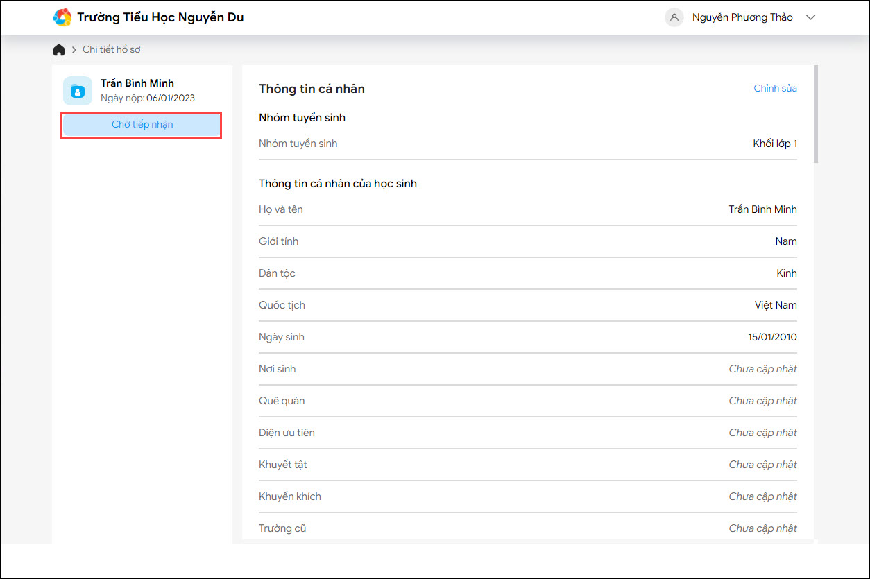 - Chờ tiếp nhận: Hồ sơ đã được nộp cho nhà trường, đang chờ hội đồng tuyển sinh sơ loại, kiểm tra thông tin, giấy tờ.