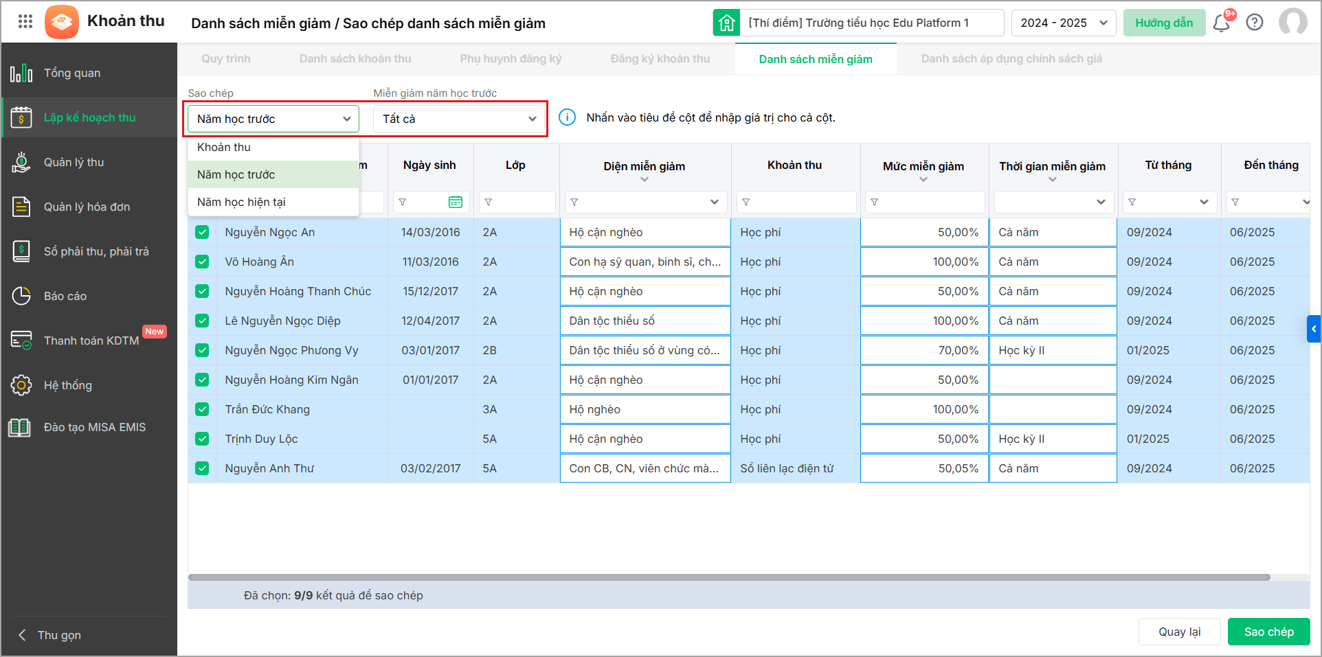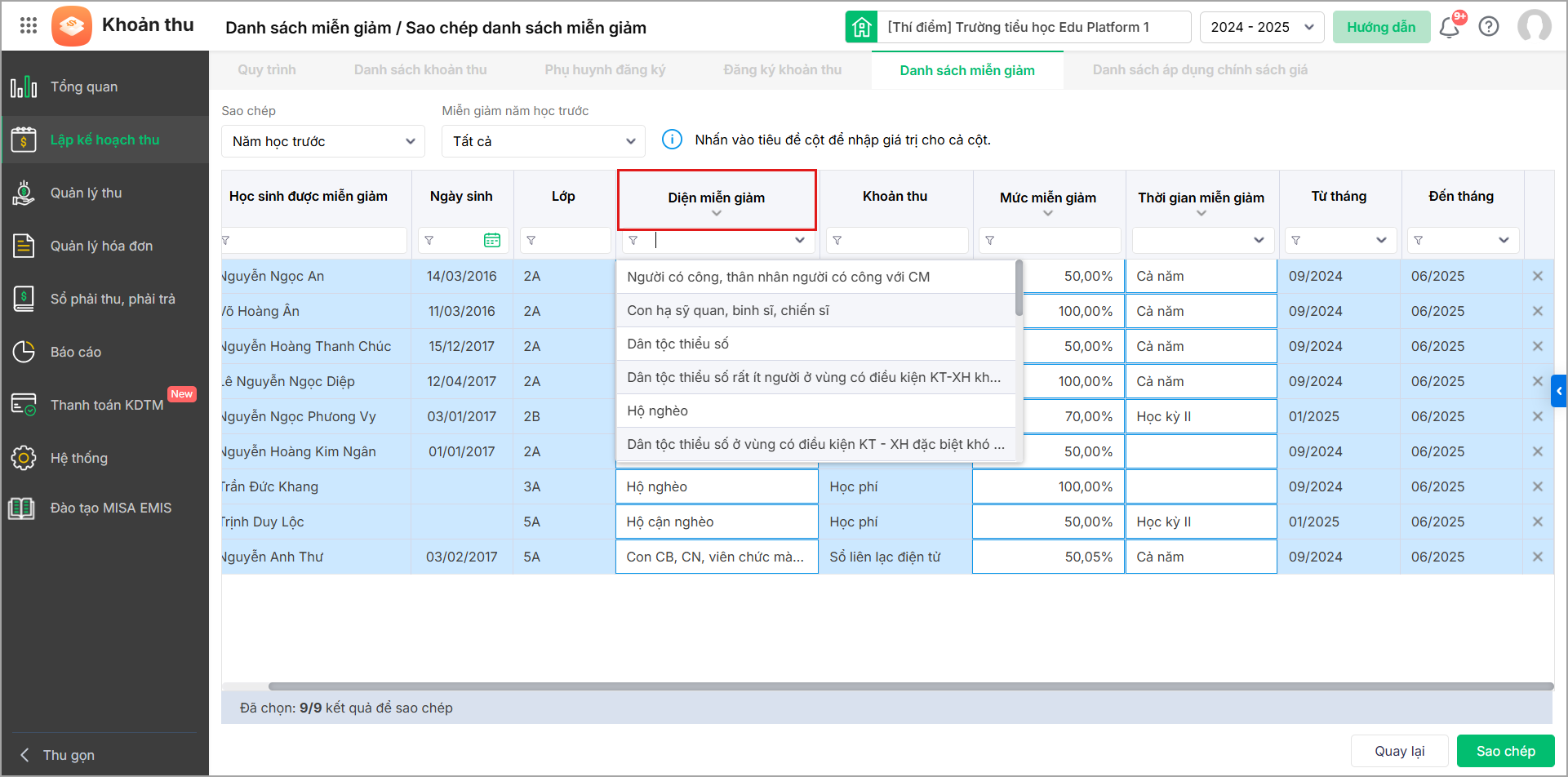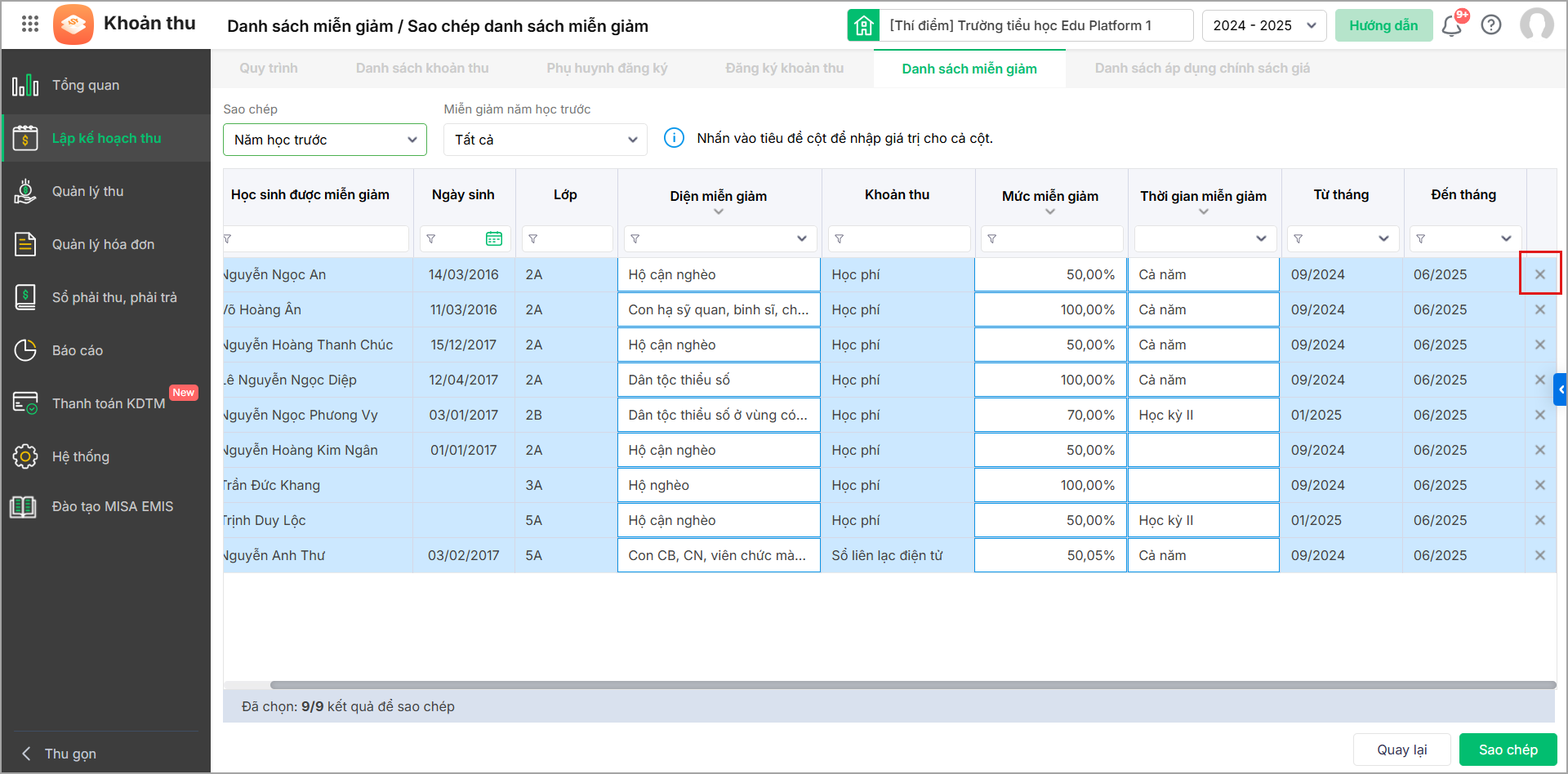 - Nhấn Sao chép để sao chép danh sách học sinh đã chọn với mức miễn giảm tương ứng.