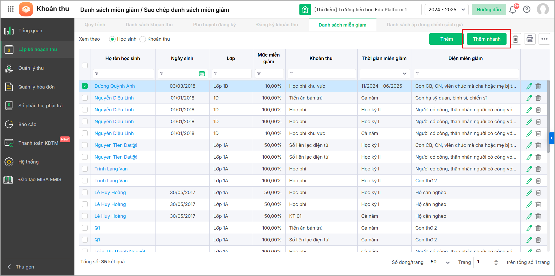 - Nhấn Thêm nhanh để thêm nhanh danh sách học sinh được miễn giảm cùng 1 khoản thu với các mức khác nhau.