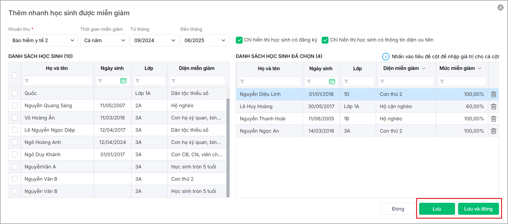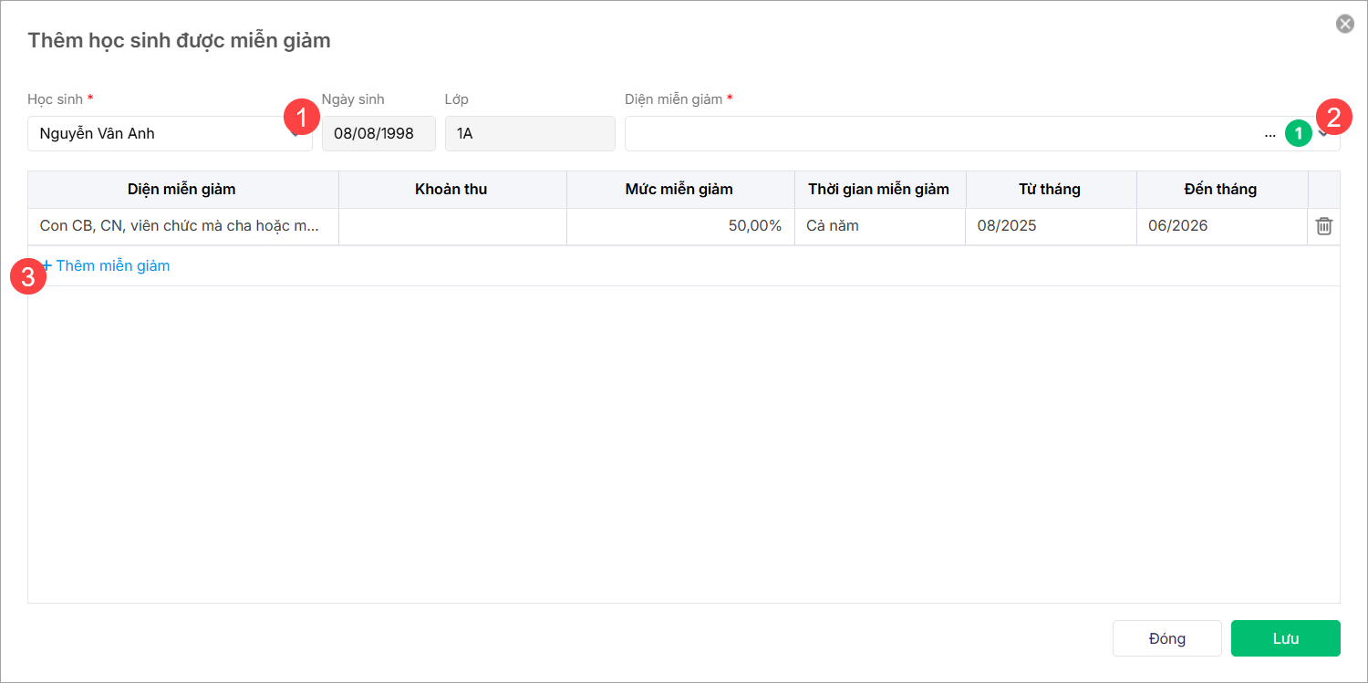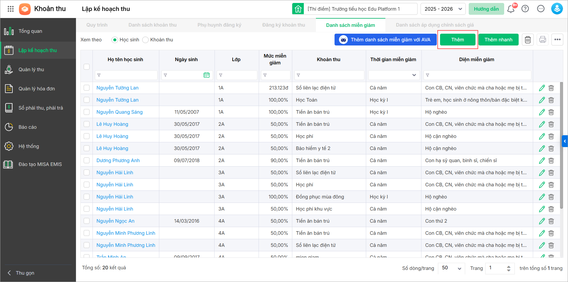 - Nhấn Thêm để thêm học sinh được đăng ký miễn giảm.