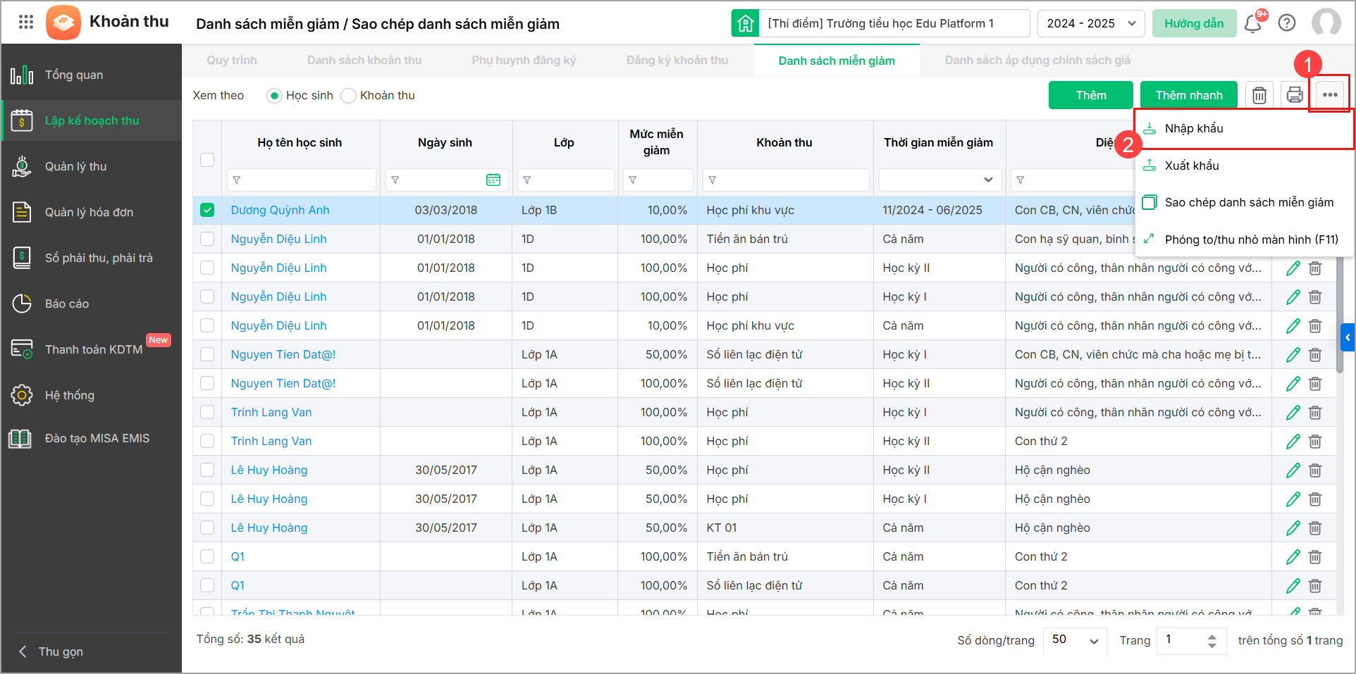 - Khoản thu sao chép: khoản thu đã có danh sách học sinh miễn giảm.