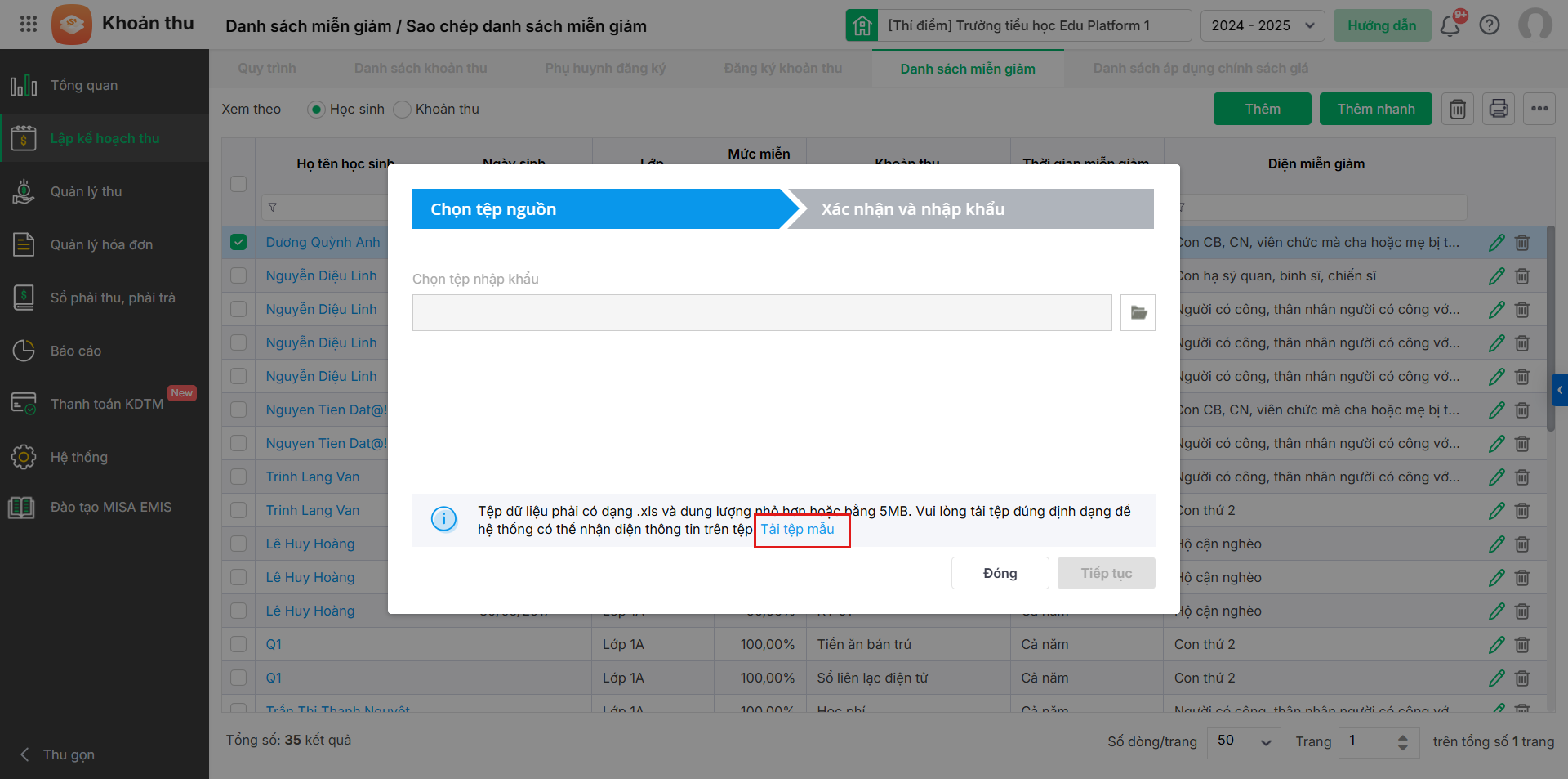 - Tải tệp mẫu excel do phần mềm cung cấp để nhập khẩu danh sách học sinh. Điền thông tin miễn giảm của các học sinh thuộc diện ưu tiên vào tệp mẫu vừa tải.