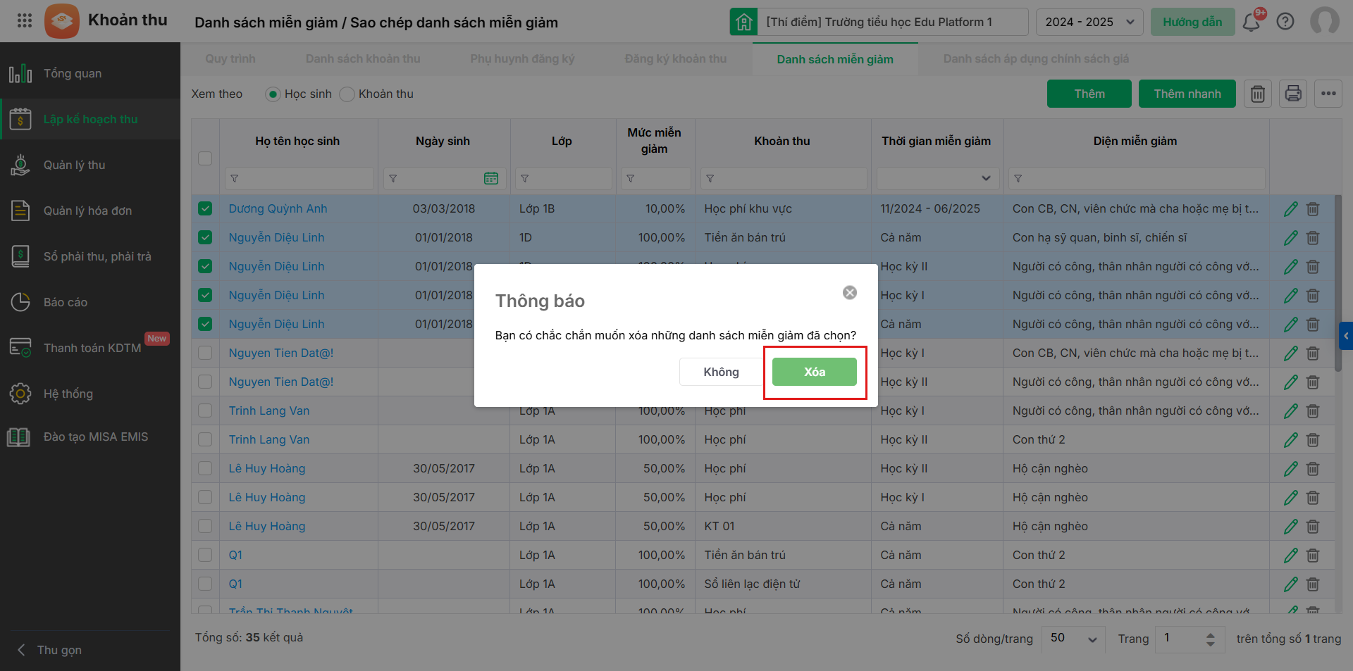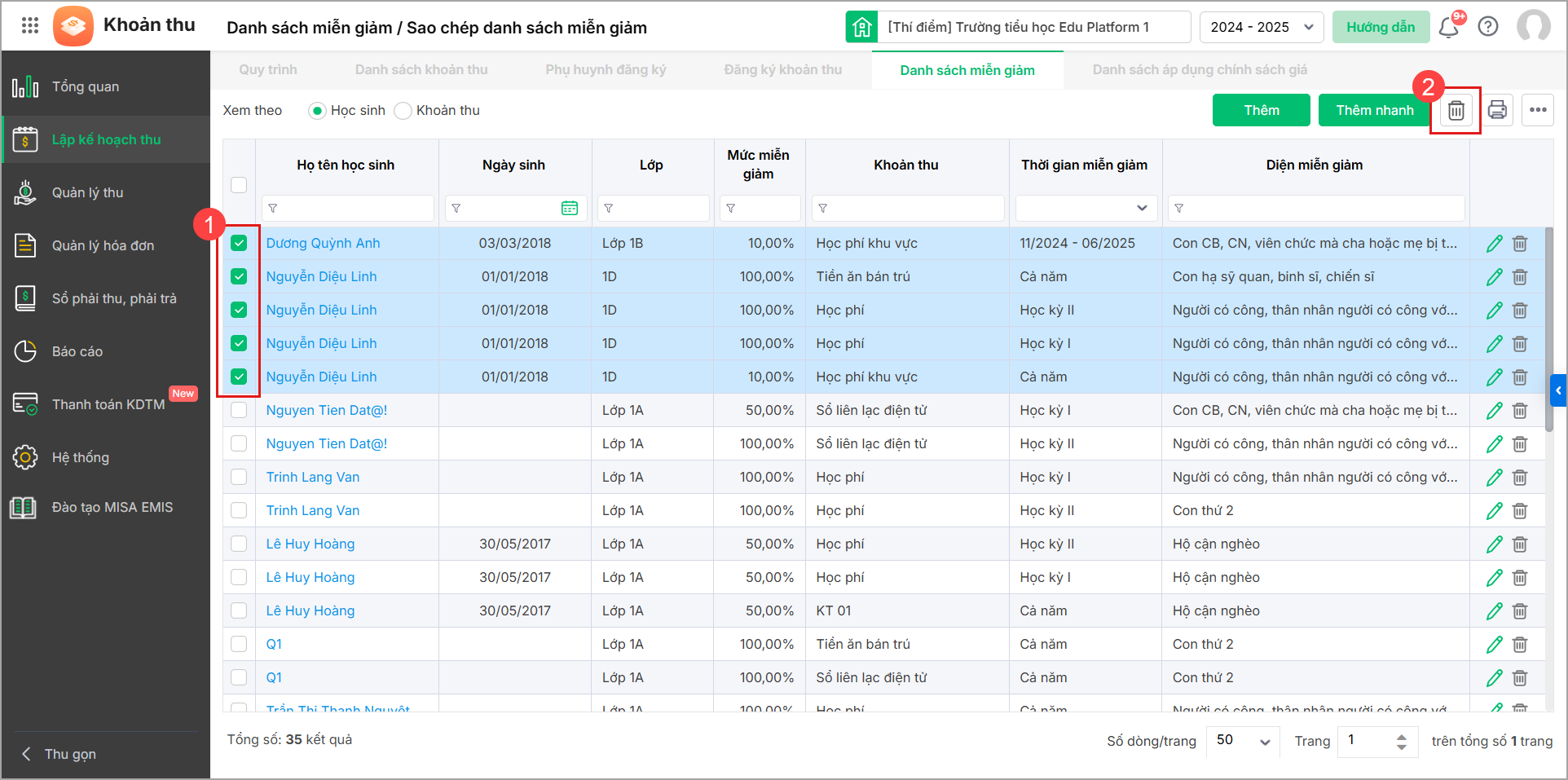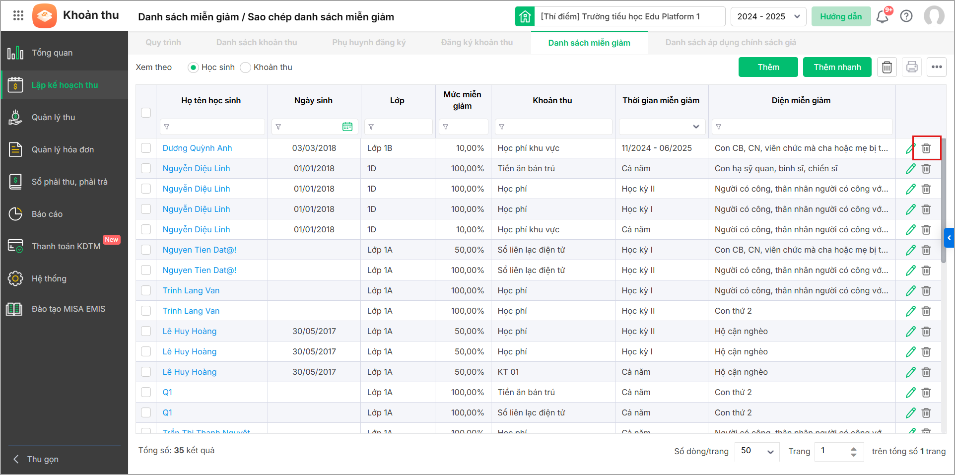 - Để xóa từng học sinh khỏi danh sách miễn giảm, nhấn vào biểu tượng thùng rác tại dòng tên học sinh tương ứng.