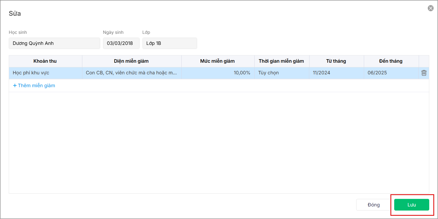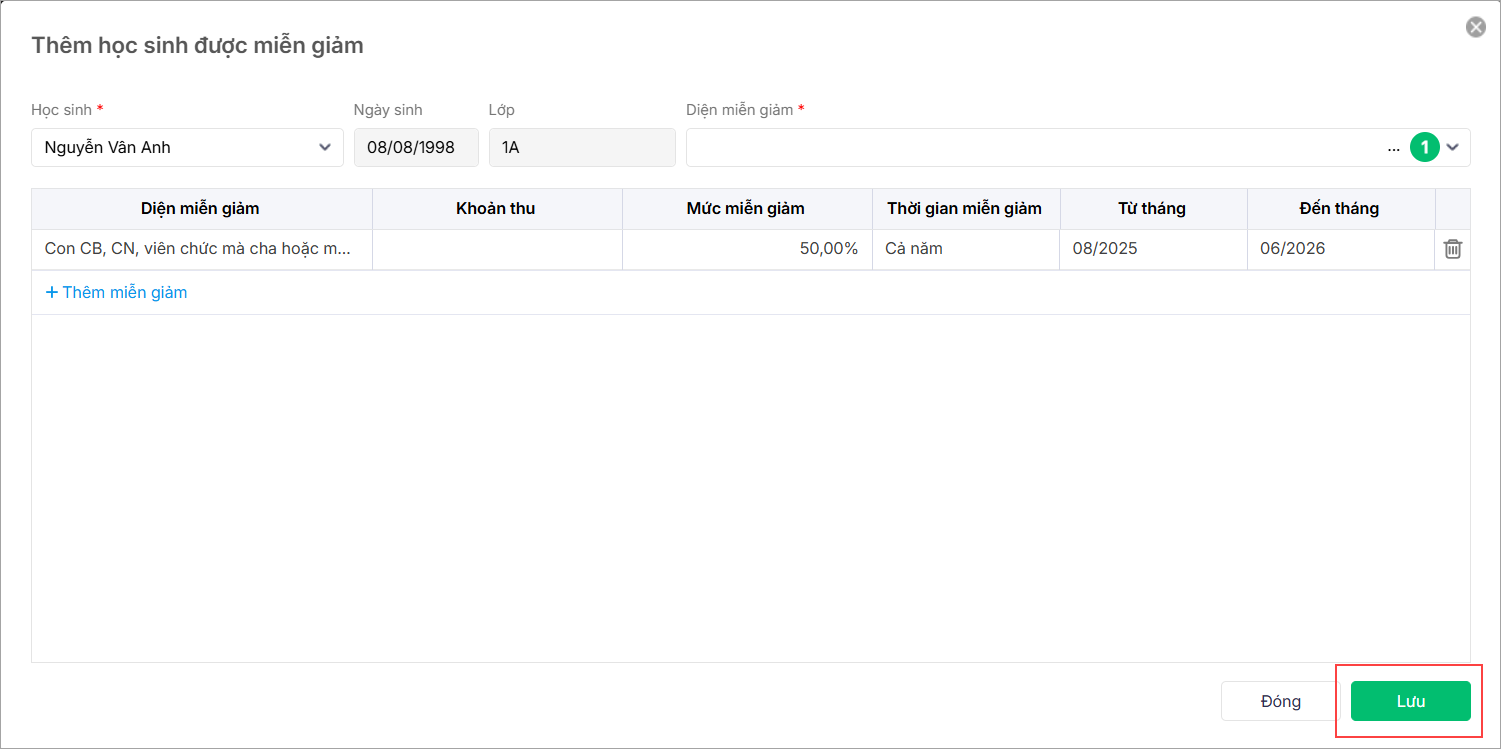 Tuy nhiên, anh/chị chỉnh sửa thông tin miễn giảm/xóa diện miễn giảm/thêm diện miễn giảm cho học sinh (nếu cần). - Nhấn Lưu để thêm thông tin miễn giảm cho học sinh.