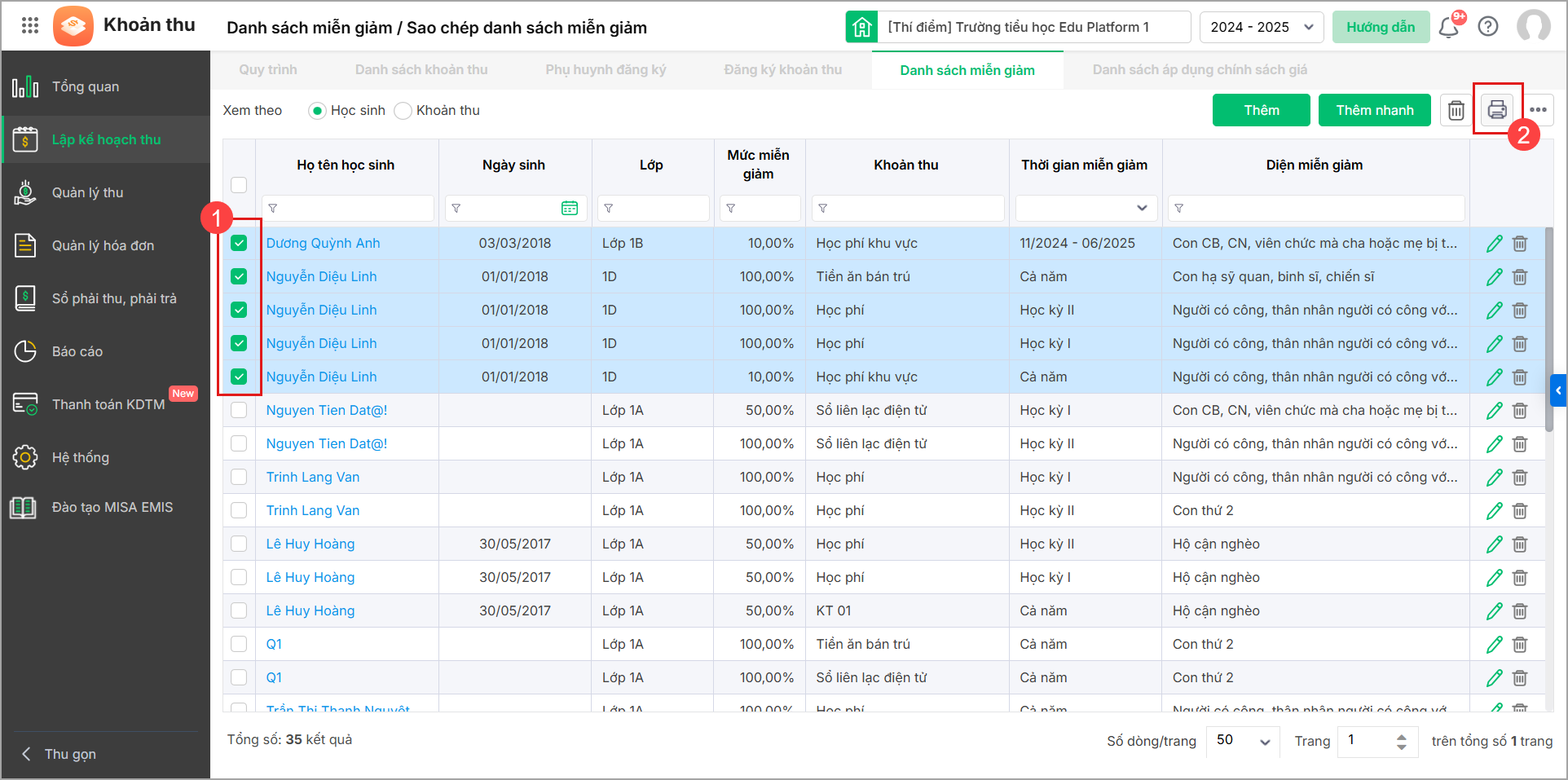 - Tích chọn học sinh thuộc diện miễn giảm và nhấn vào biểu tượng máy in.