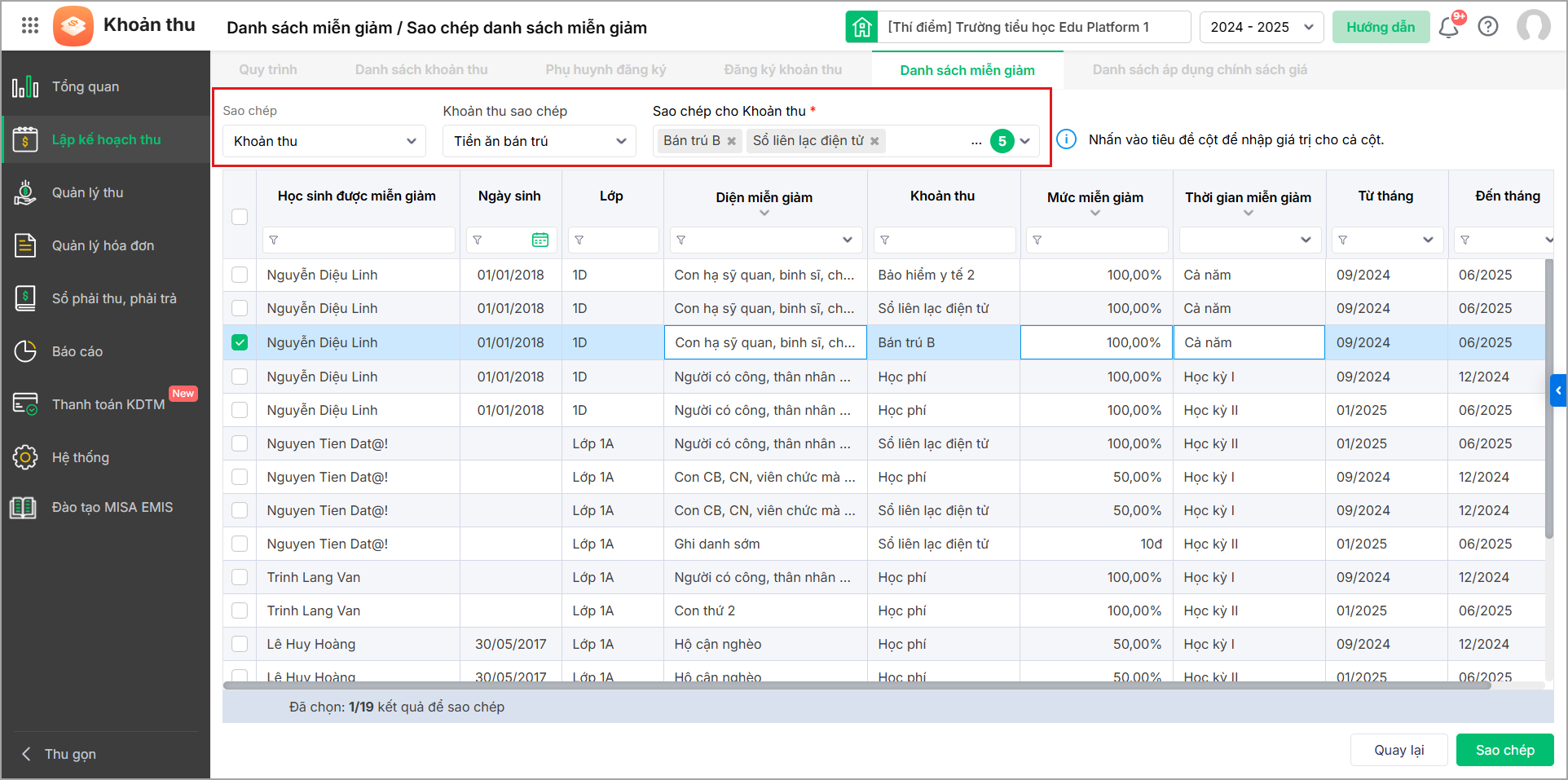 - Nhấn Sao chép để sao chép danh sách học sinh đã chọn với mức miễn giảm tương ứng.