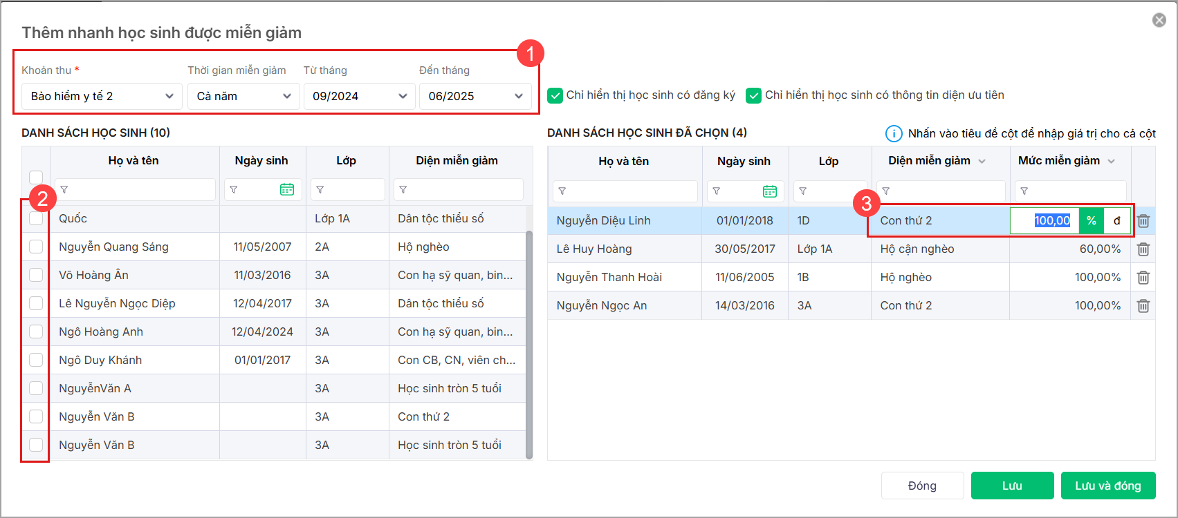 - Nhấn Thêm để thêm học sinh được đăng ký miễn giảm.