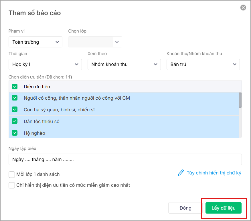 - Tích chọn Chỉ hiển thị học sinh có thông tin diện ưu tiên để hiển thị học sinh có thông tin diện ưu tiên đã đăng ký trên hồ sơ học sinh.