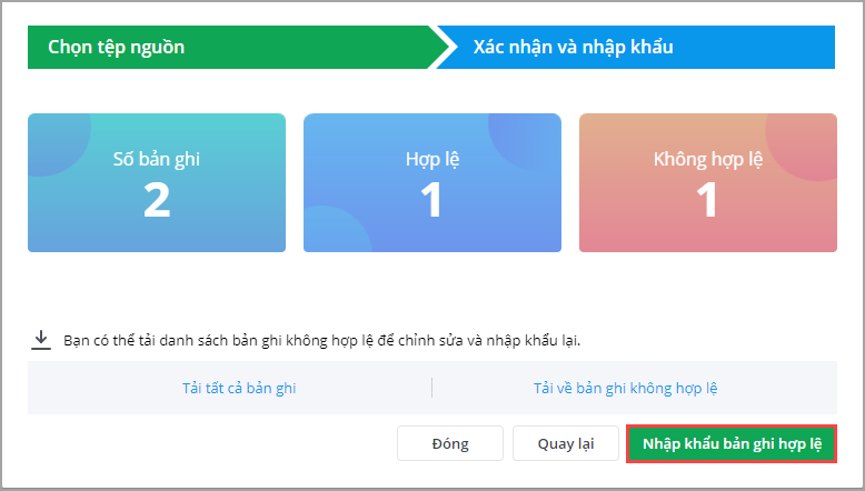 Lưu ý: Đối với những bản ghi không hợp lệ, anh/chị tải về bản ghi để kiểm tra và chỉnh sửa. Sau đó nhập khẩu lại vào phần mềm.