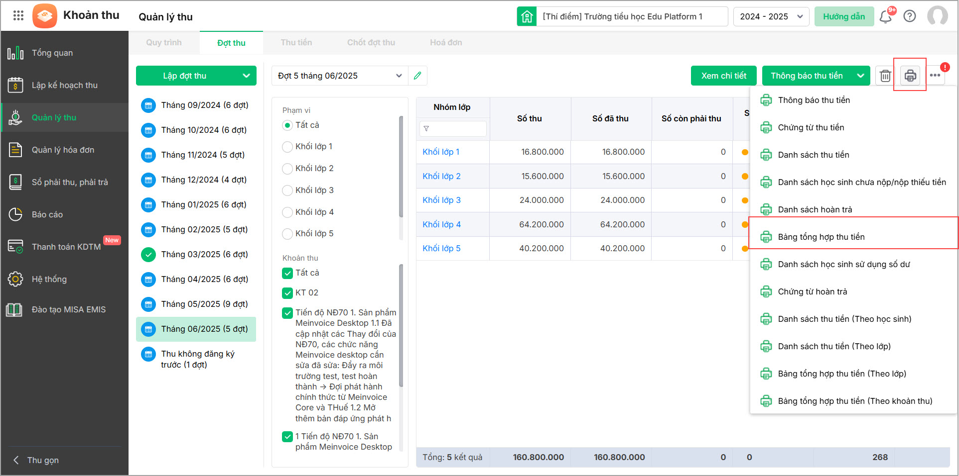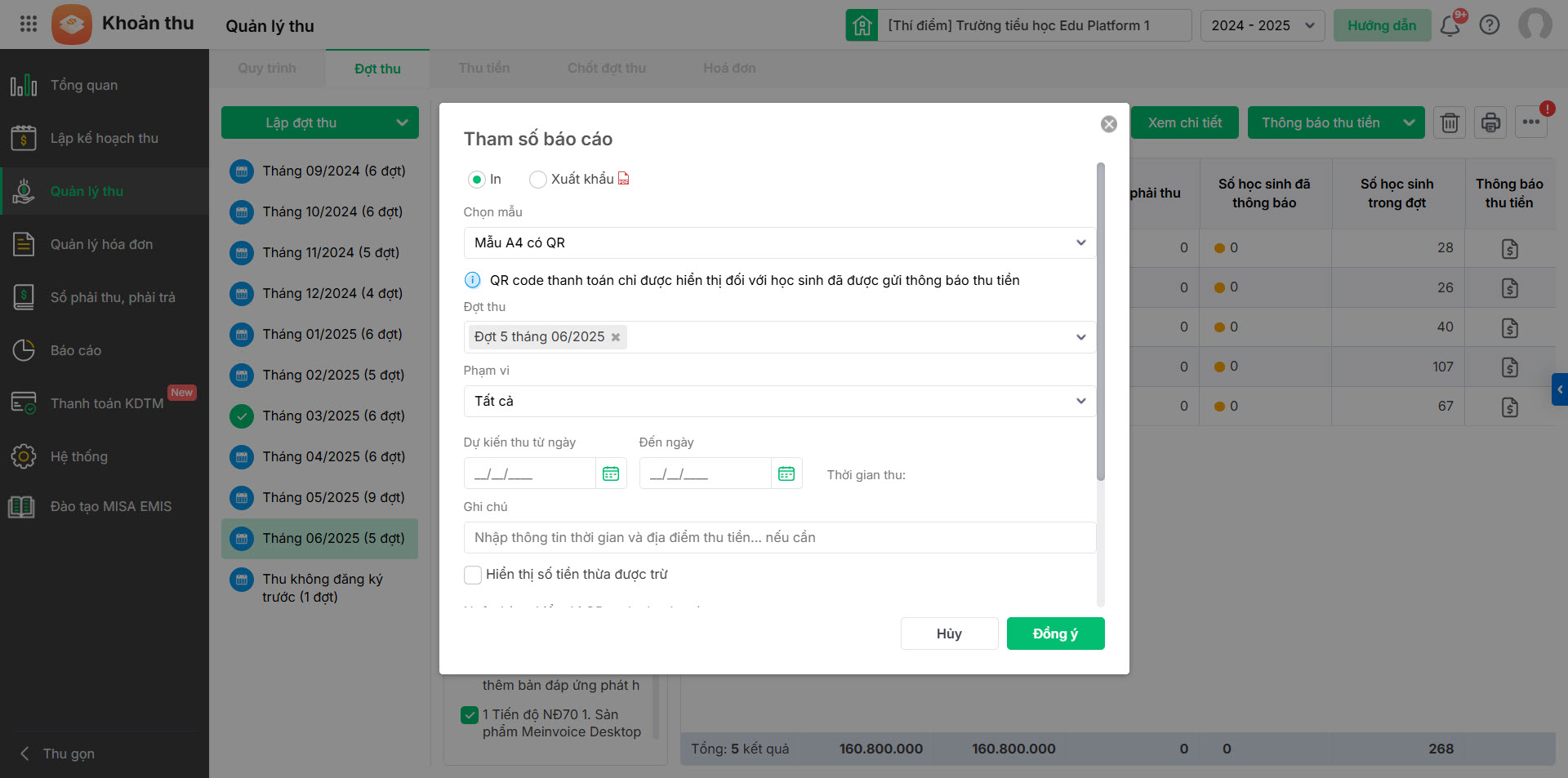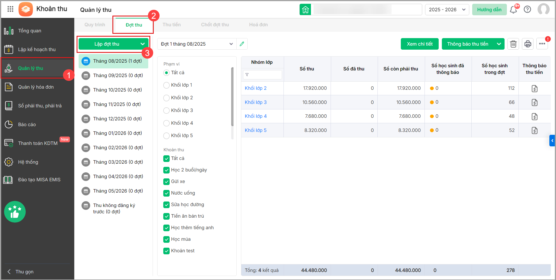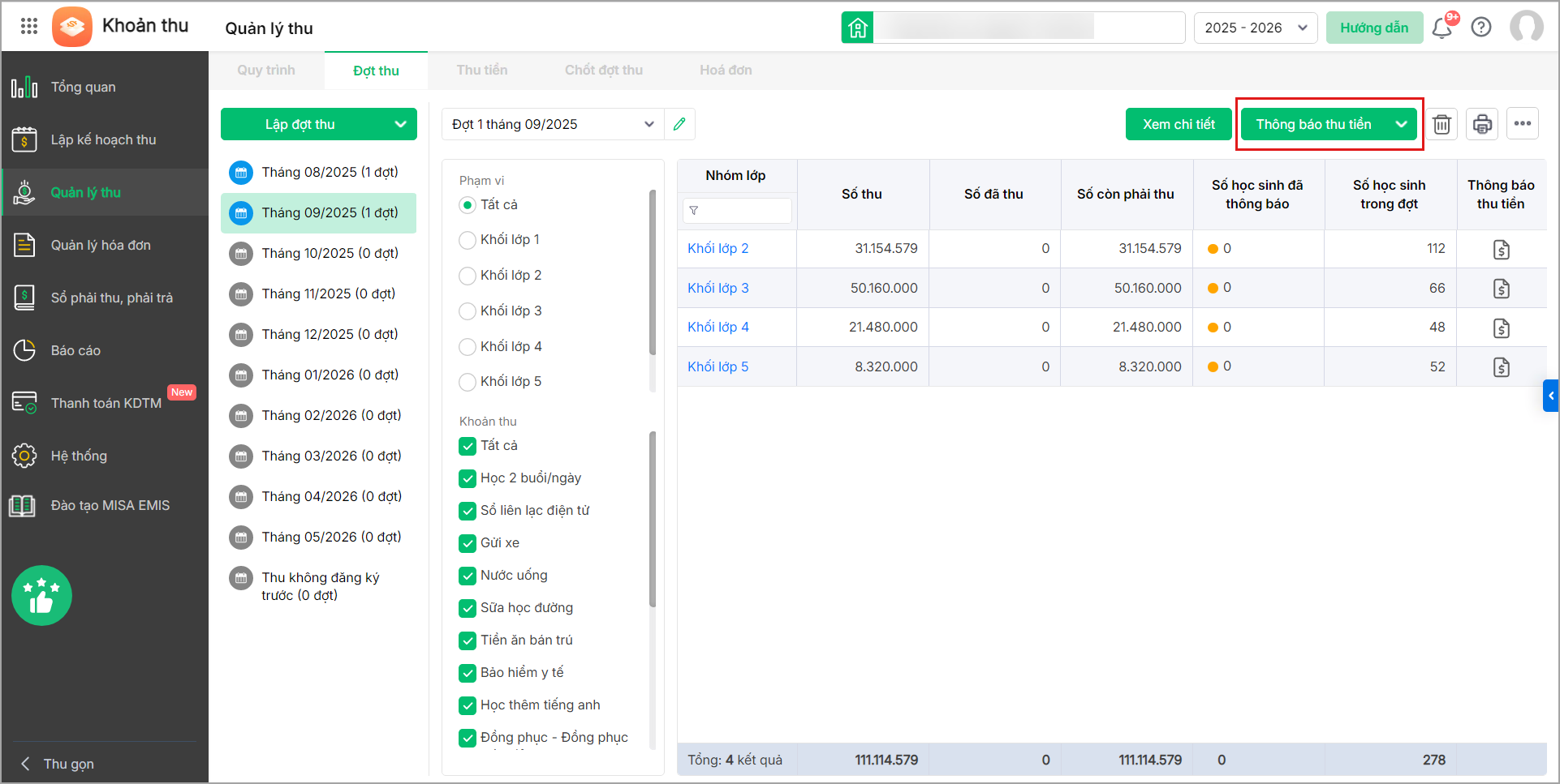 - Chọn Đợt thu, Phạm vi (Tất cả, khối, lớp).