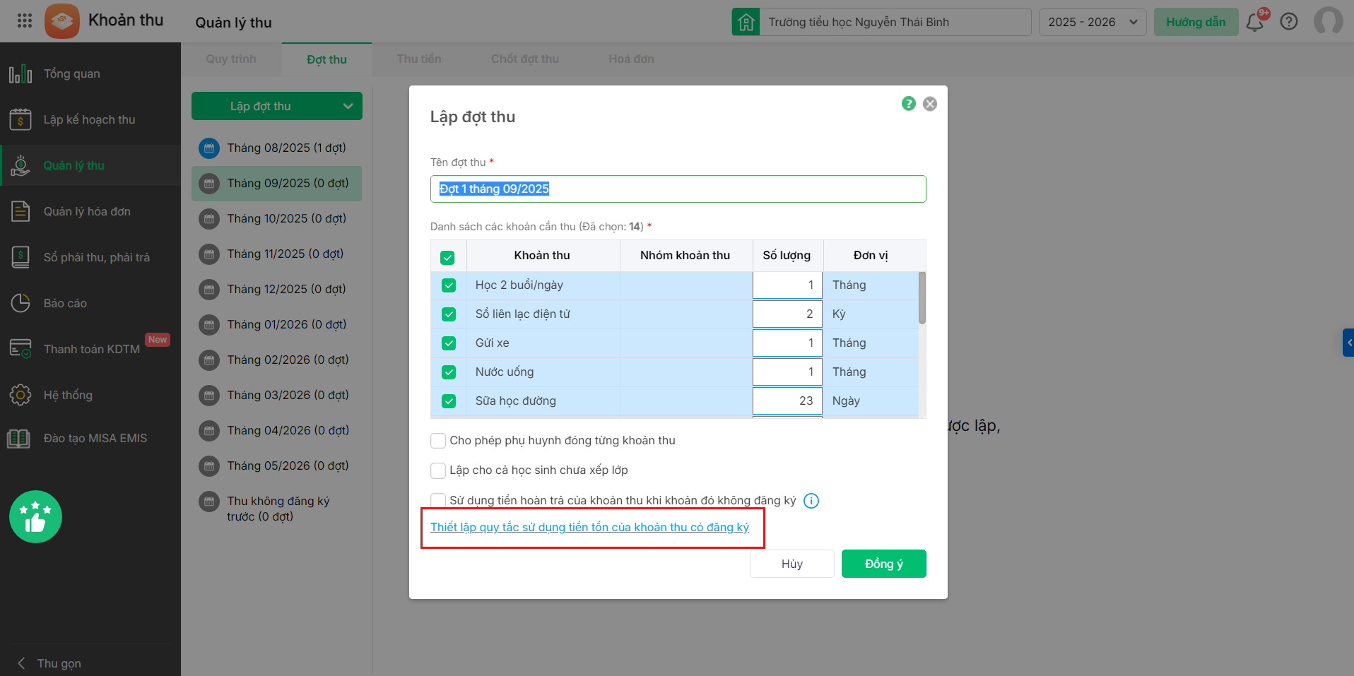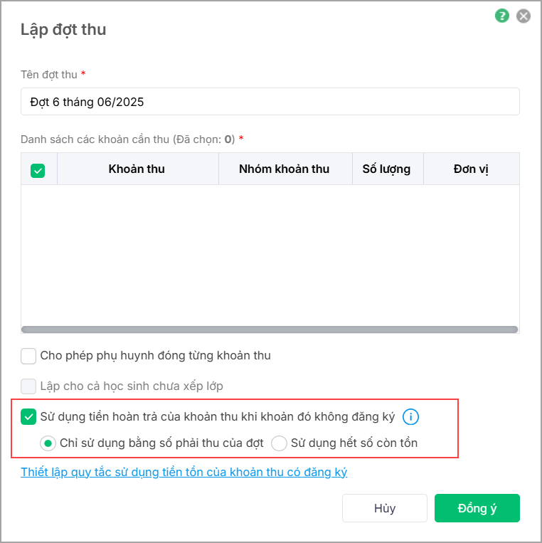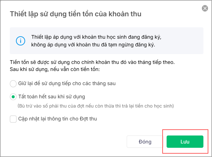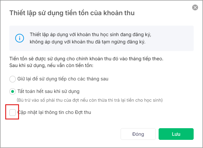 - Cập nhật lại thông tin cho Đợt thu: Tích chọn những khoản thu đã lập để cập nhật thiết lập sử dụng tiền tồn cho đợt thu đó.