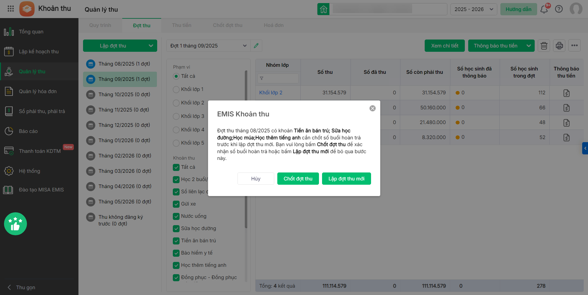 Lưu ý: Trường hợp nếu tháng trước đơn vị có đợt thu liên quan đến khoản thu có hoàn trả, phần mềm hiển thị cảnh báo để kế toán chốt đợt thu trước khi lập đợt thu mới hoặc Lập đợt thu mới.