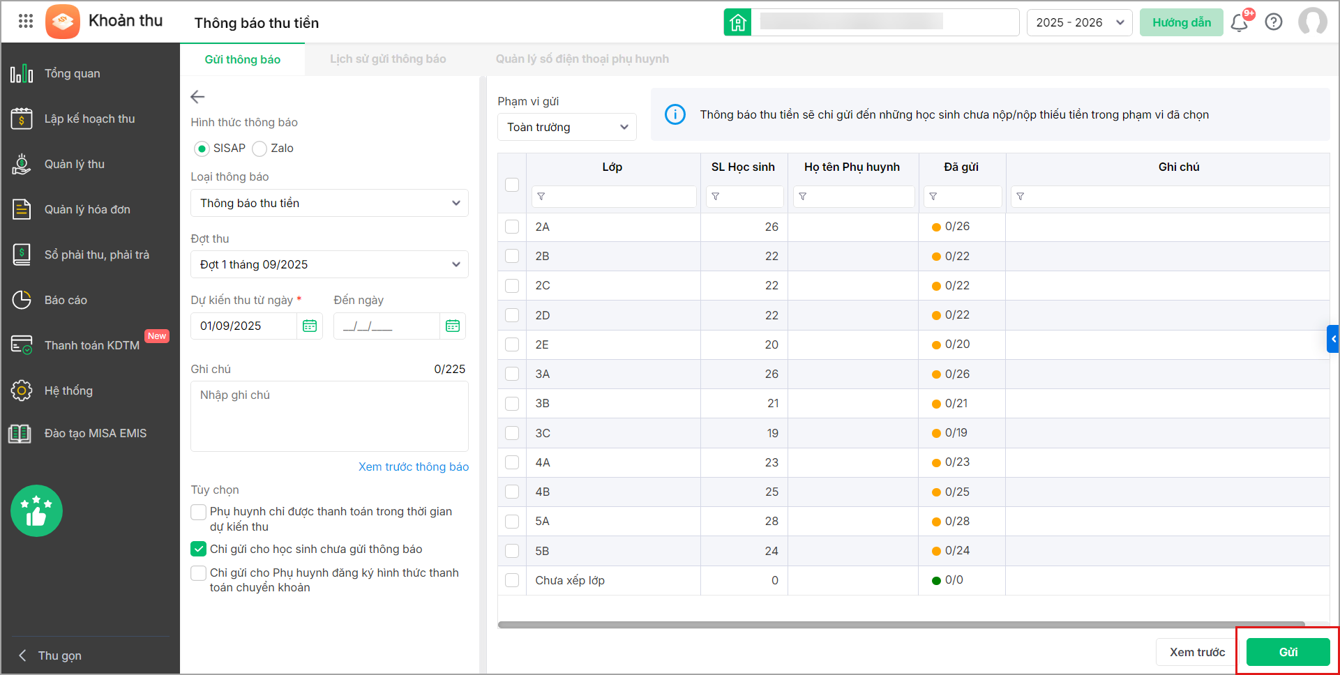 - Chọn phạm vi gửi: Tất cả hoặc theo học sinh: phần mềm tự động lấy lên danh sách khoản thu tương ứng.