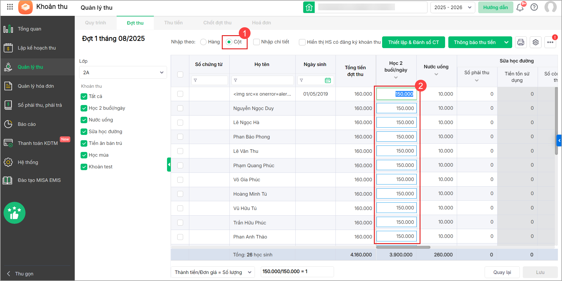 - Trường hợp thay đổi số tiền phải thu theo từng khoản thu cho nhóm học sinh/cả lớp, anh/chị chọn nhập Theo cột.