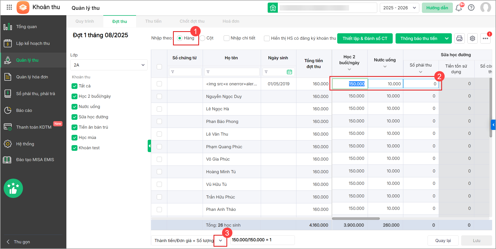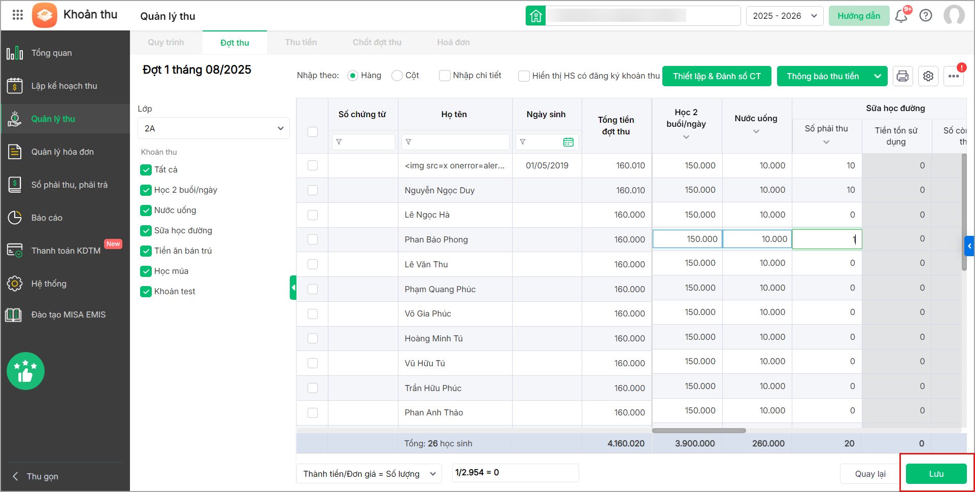 - Anh/chị có thể ghi nhận theo học sinh hoặc ghi nhận theo đợt thu.