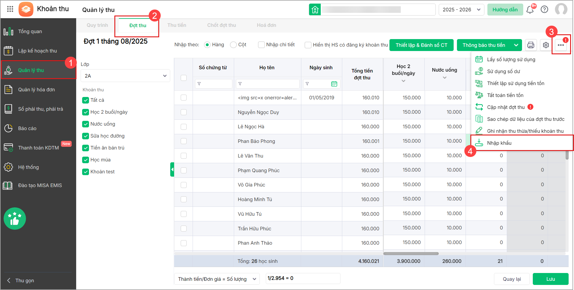 - Vào Quản lý thu\Đợt thu, chọn biểu tượng ba chấm, nhấn Nhập khẩu.