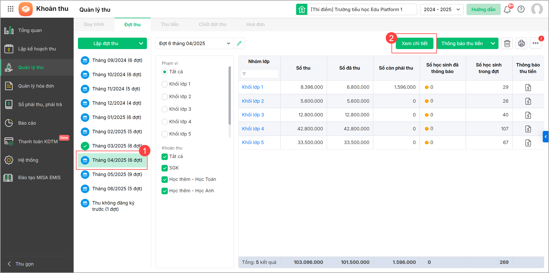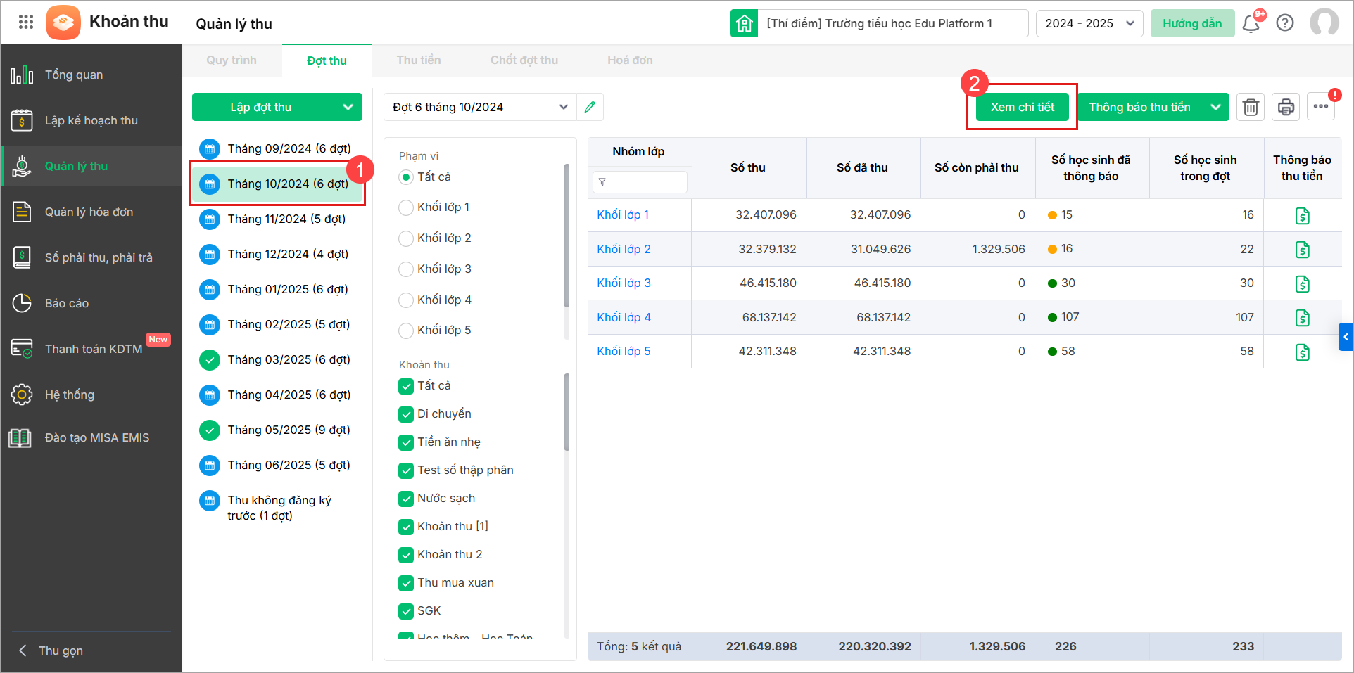 - Vào Quản lý thu\Đợt thu, chọn đợt thu và nhấn Xem chi tiết.