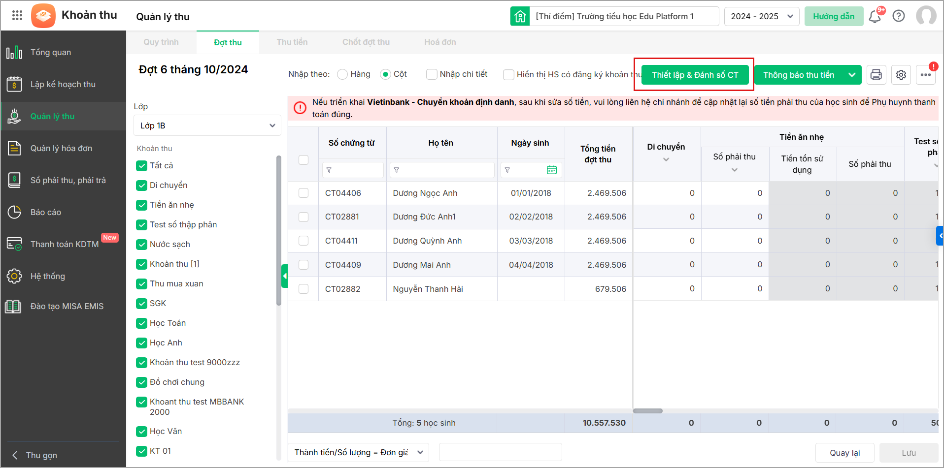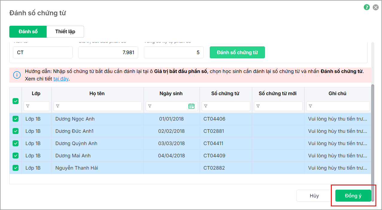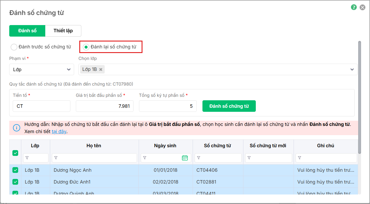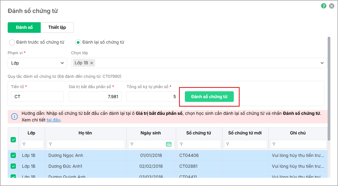 Trường hợp kế toán đánh số chứng từ nhầm cho học sinh không phải lập chứng từ thu tiền (thu qua chuyển khoản hoặc học sinh đó không đăng ký khoản thu có xuất chứng từ,…) hoặc thêm/bớt học sinh vào đợt thu, thì phải đánh lại số chứng từ từ đầu cho tất cả học sinh, đảm bảo số chứng từ liên tục theo quy định.
