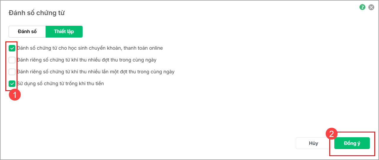 - Thiết lập thông tin đánh số chứng từ vào ô tương ứng: