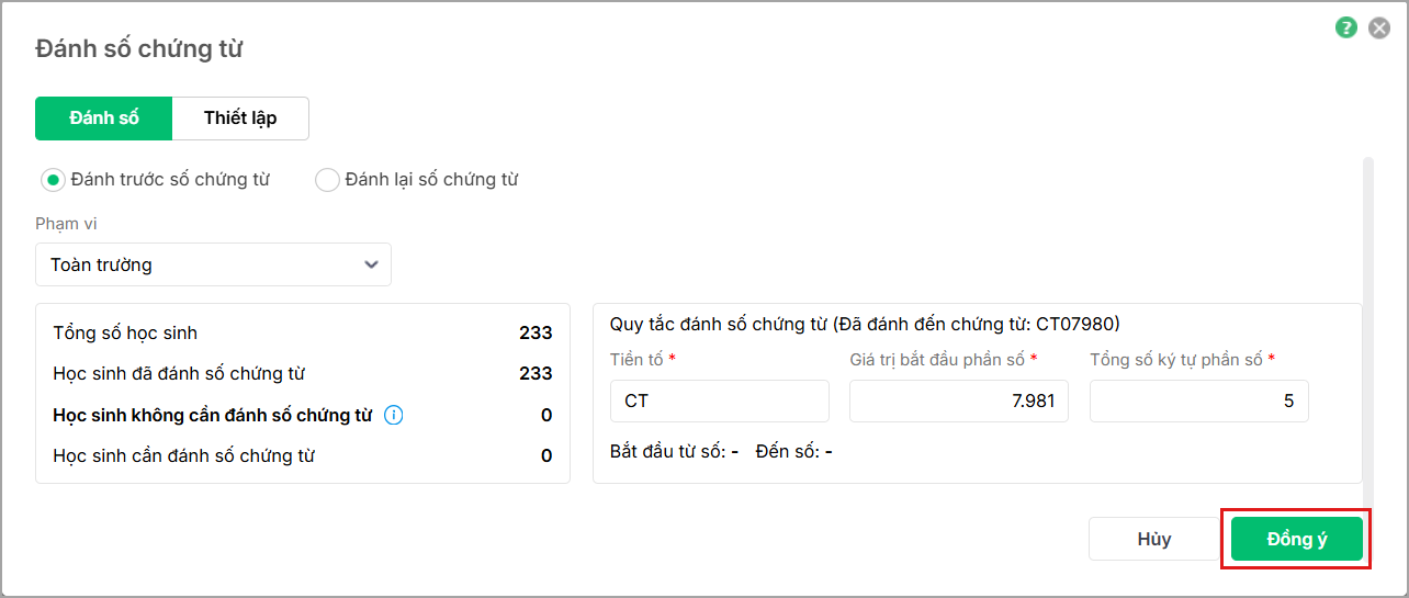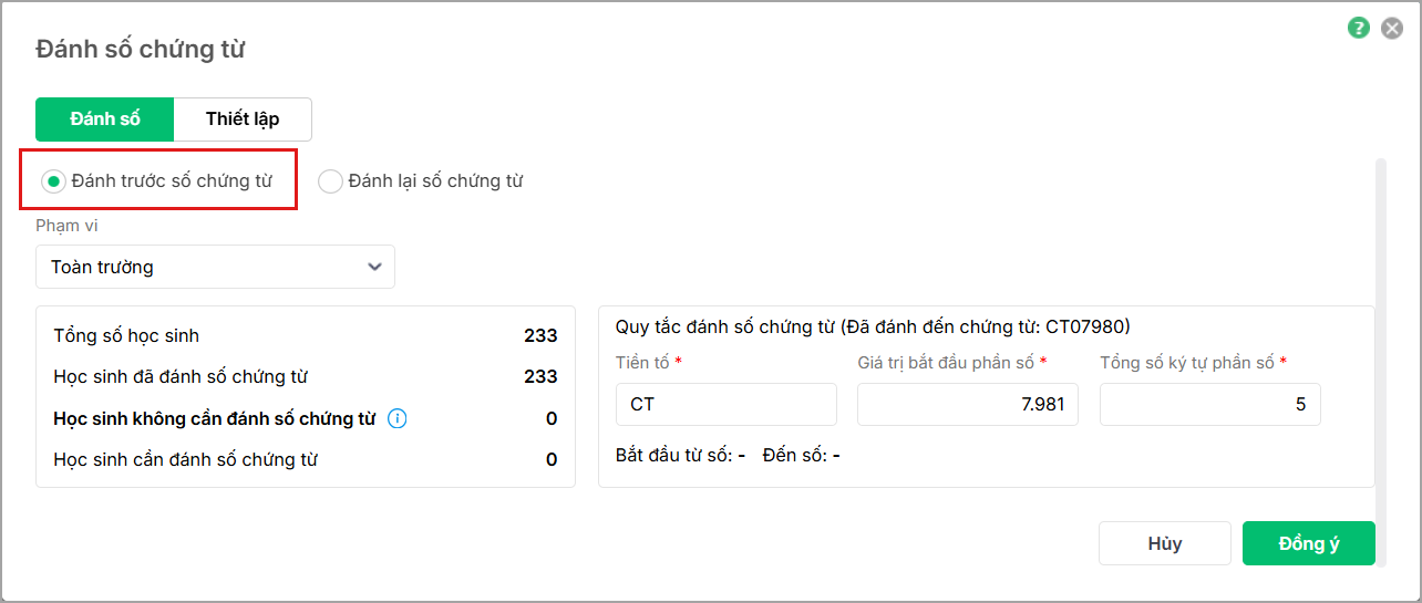 - Chọn Phạm vi muốn đánh trước số chứng từ cho Toàn trường/Khối/Lớp.