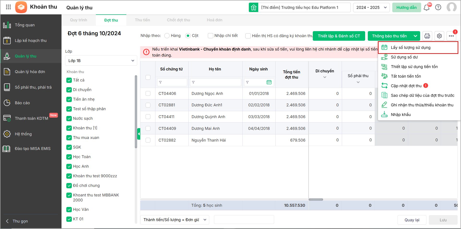 - Vào Khoản thu\Đợt thu, chọn đợt thu cần lấy số lượng.