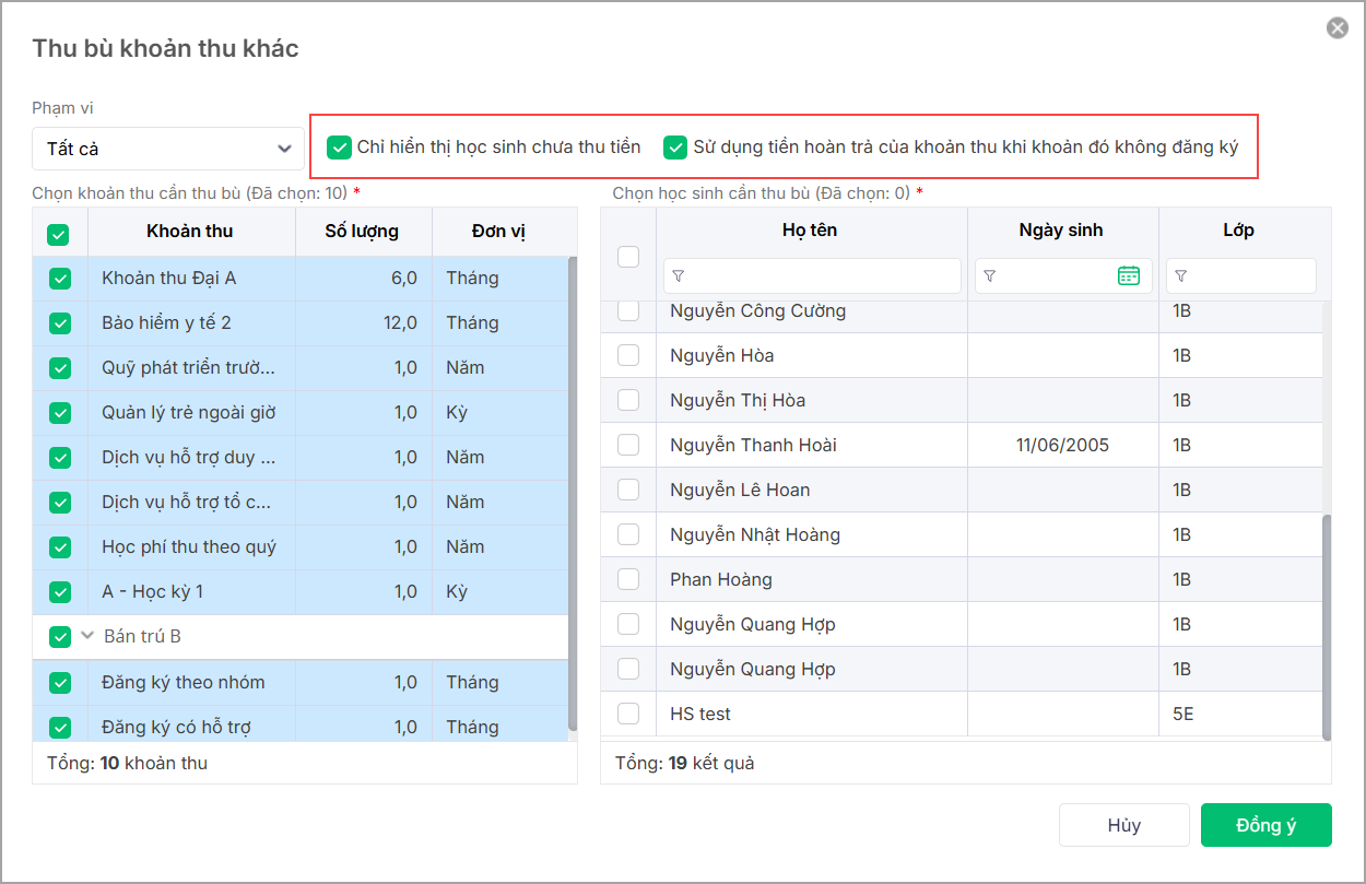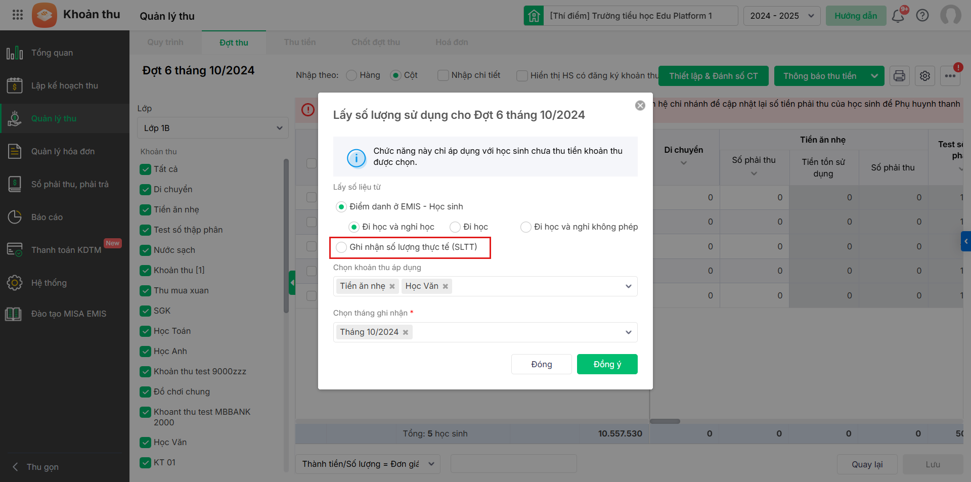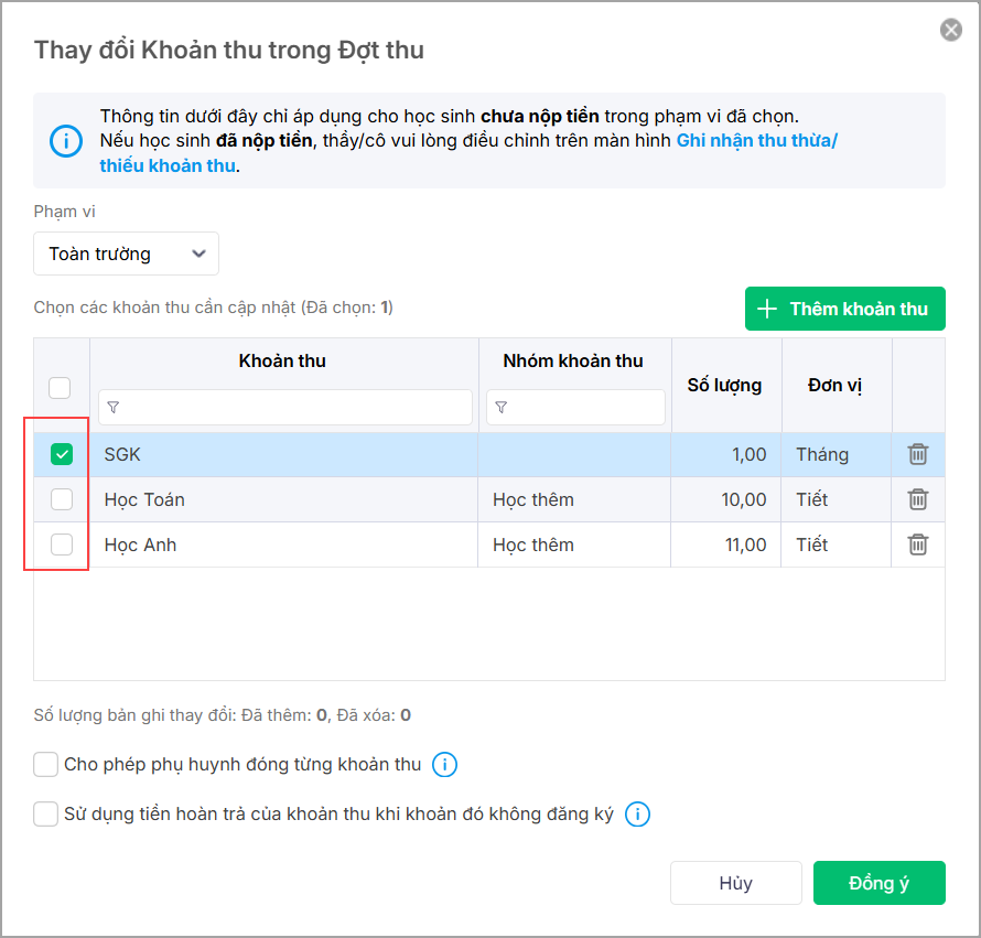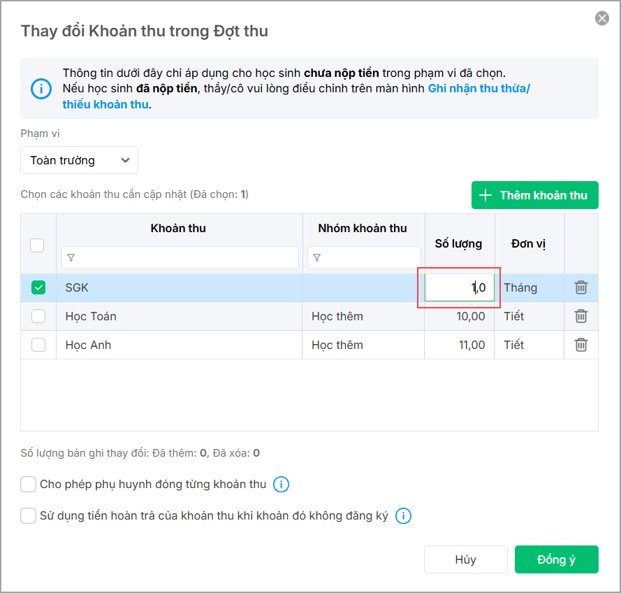 Lưu ý: tính năng này chỉ áp dụng với các khoản thu có đơn vị tính là Ngày, buổi, không có hoàn trả và học sinh chưa thu tiền khoản thu được chọn.