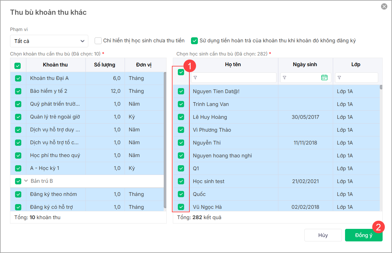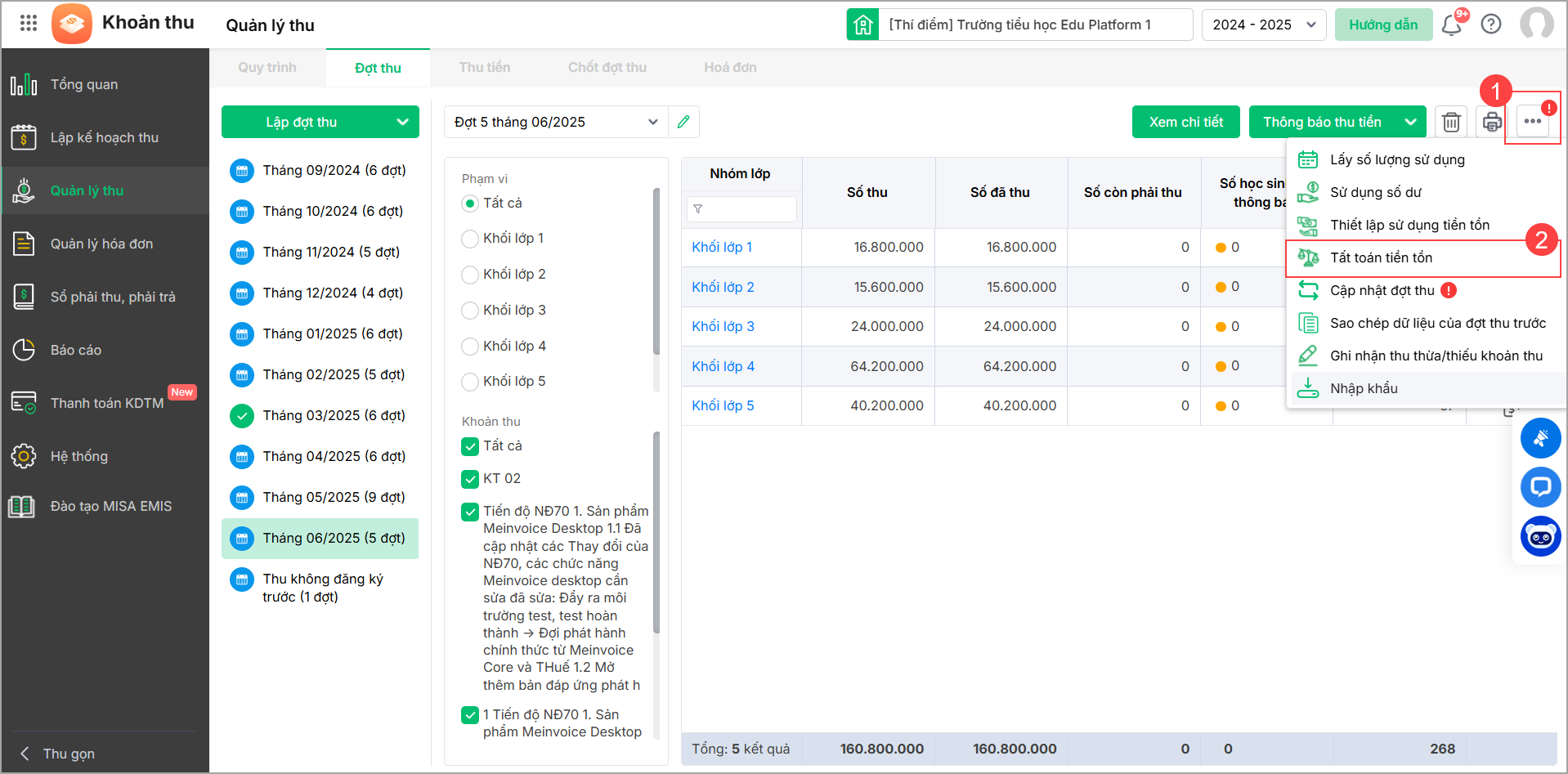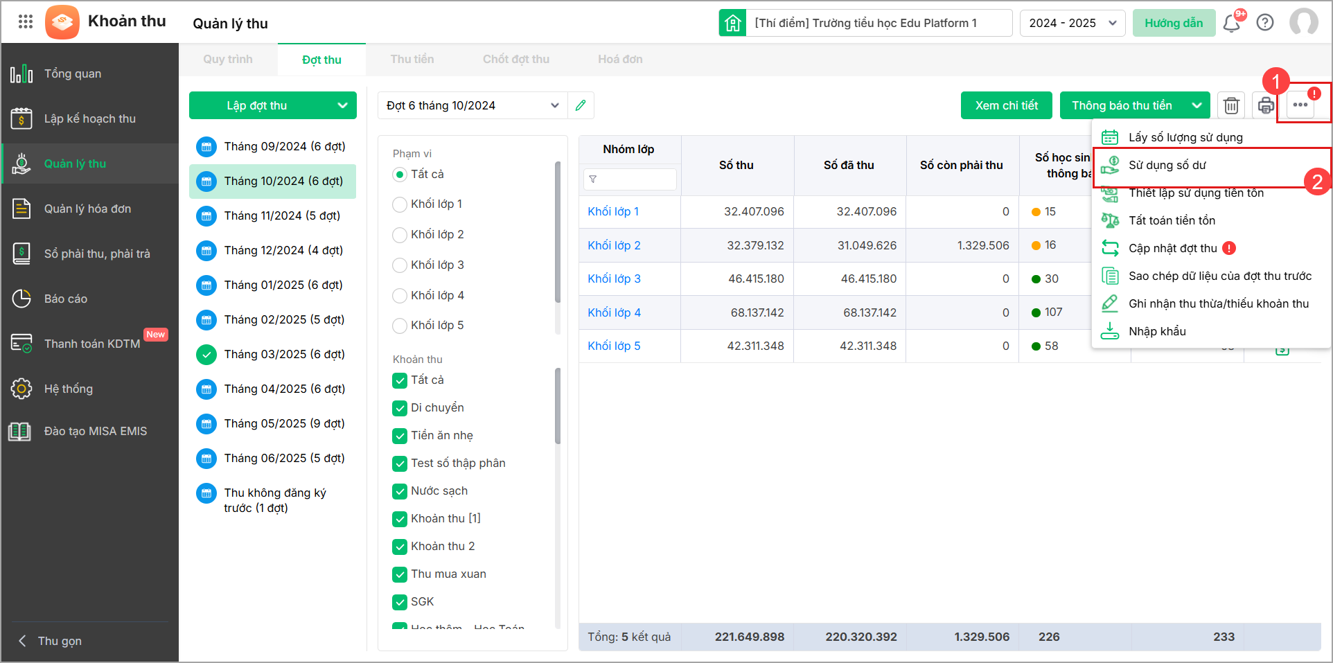 - Tất cả khoản thu: Ví dụ tiền tồn của khoản tiền ăn sẽ được sử dụng cho các khoản thu khác như nước uống, bán trú,…