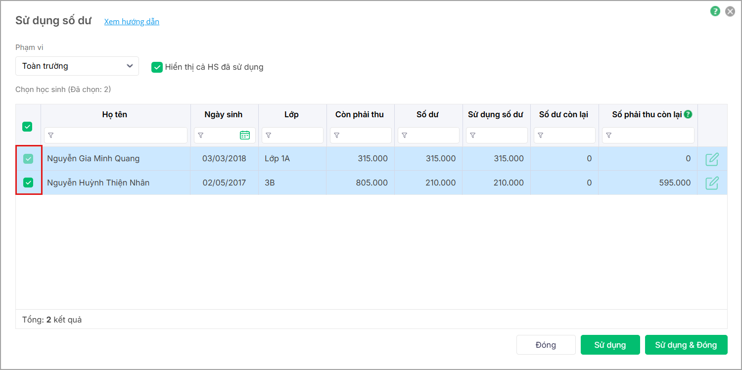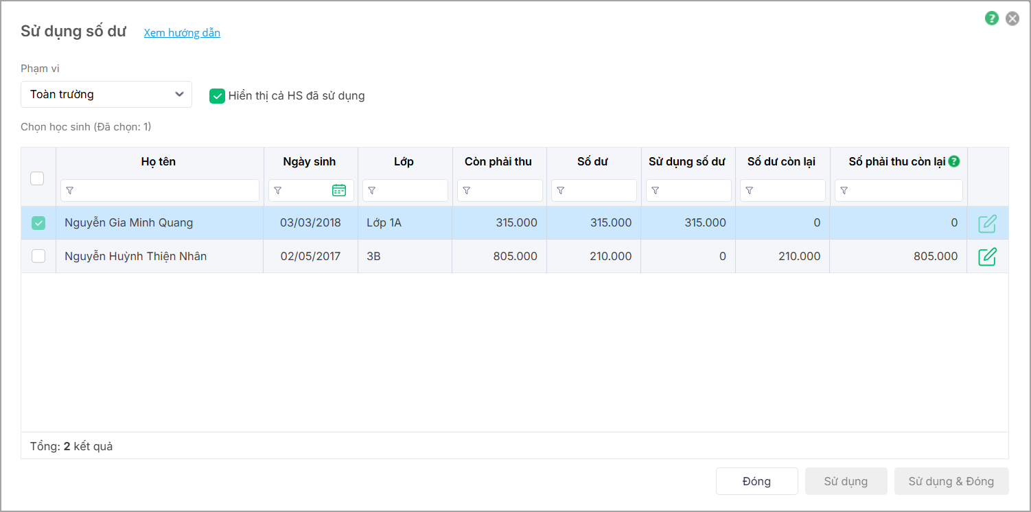 Kế toán in danh sách học sinh sử dụng số dư của từng đợt thu hoặc trong một khoảng thời gian theo hướng dẫn chi tiết tại đây.