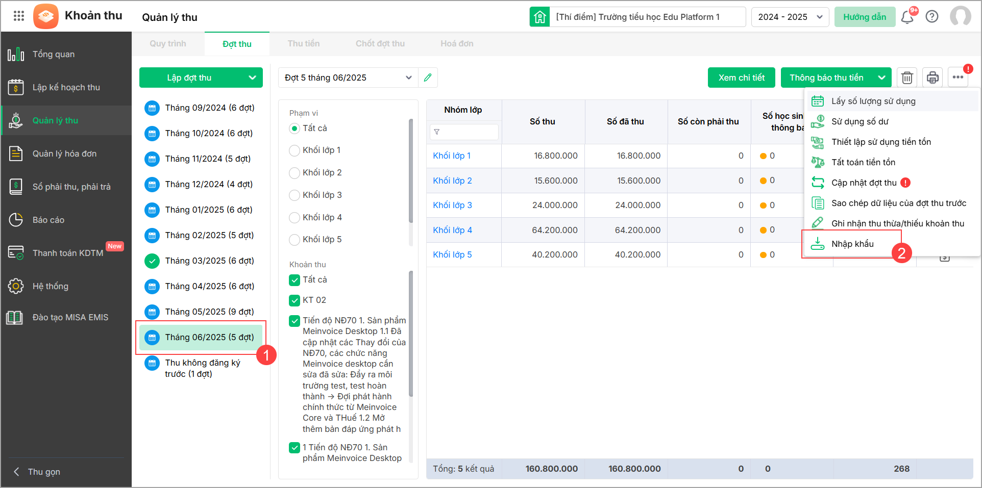 - Chọn đợt thu cần nhập khẩu cập nhật và nhấn vào dấu ba chấm, chọn Nhập khẩu.