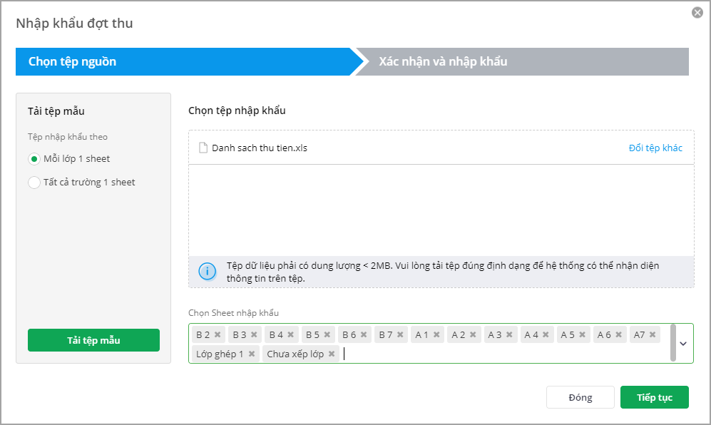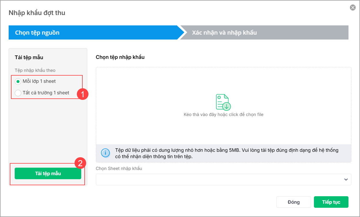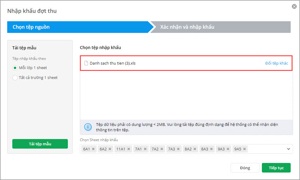 - Chọn hình thức tệp mẫu: Mỗi lớp 1 sheet hoặc Tất cả trường 1 sheet.