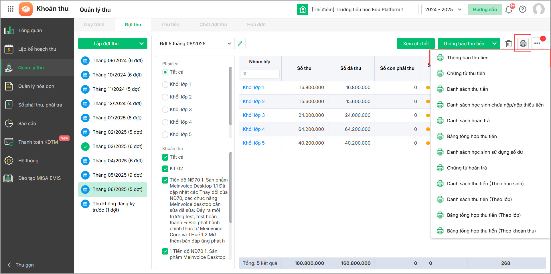- Nhấn biểu tượng máy in trên màn hình Lập đợt thu, chọn Thông báo thu tiền.