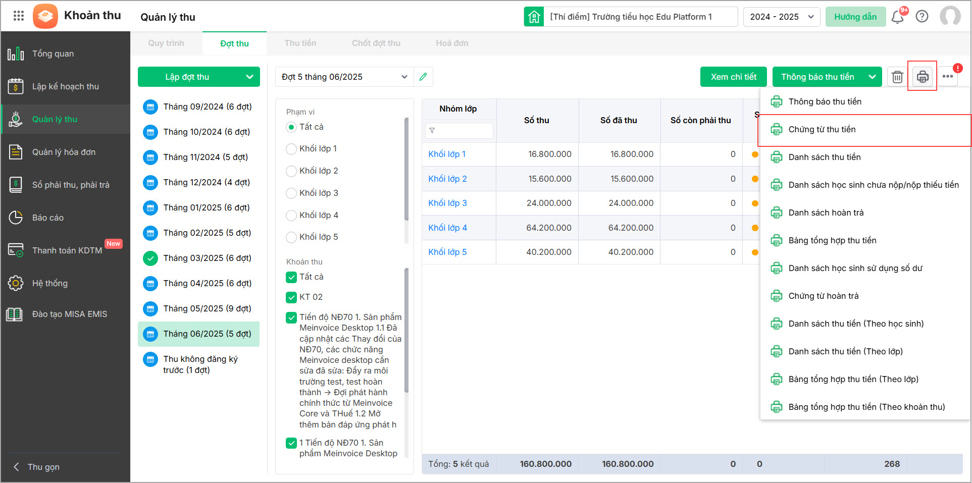 - Nhấn biểu tượng máy in trên màn hình Lập đợt thu, chọn Chứng từ thu tiền.
