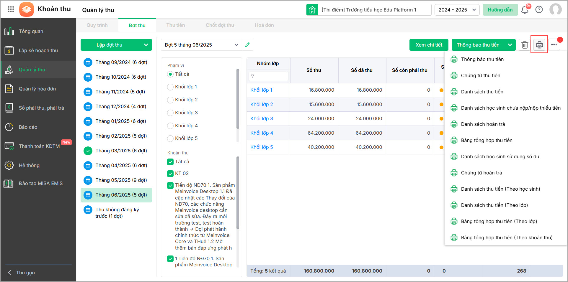 - Vào Quản lý thu\Đợt thu, chọn đợt thu cần in các biểu mẫu, báo cáo. Nhấn vào biểu tượng máy in.