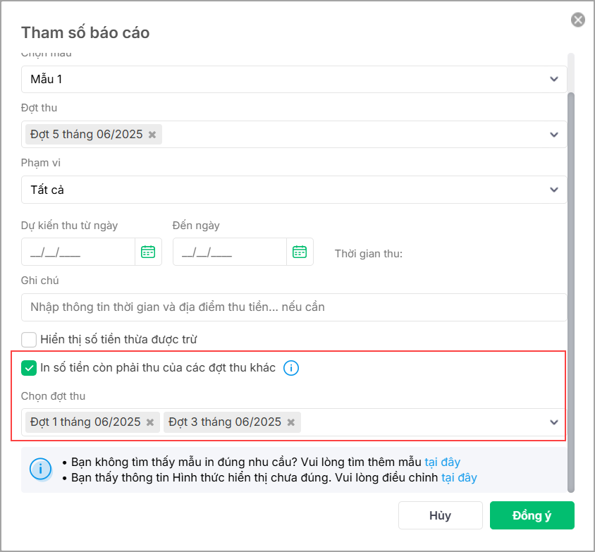 - Tích chọn In số tiền còn phải thu của các đợt thu khác và chọn đợt thu. Phần mềm tự động lấy lên danh sách các đợt thu chưa thu đủ (bao gồm cả đợt thu của năm học cũ) để thực hiện thu bù vào tháng này.