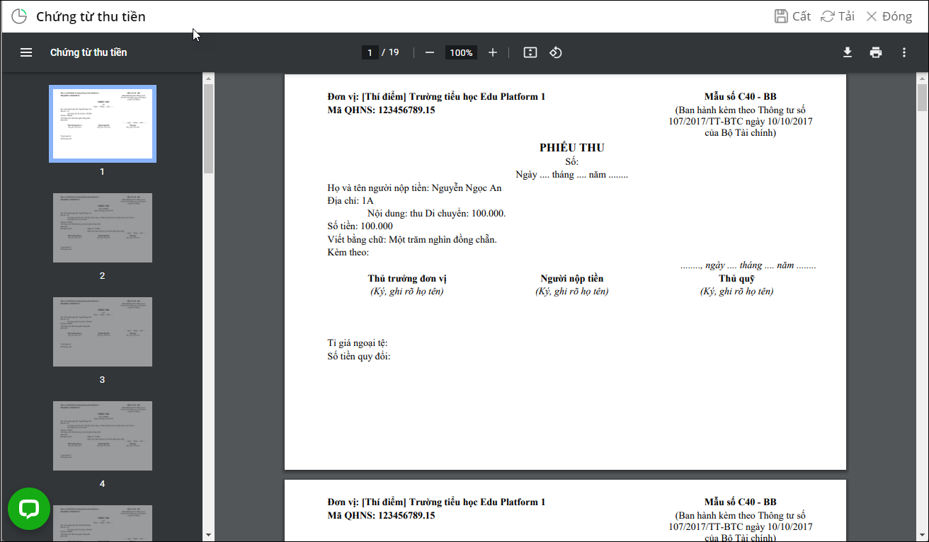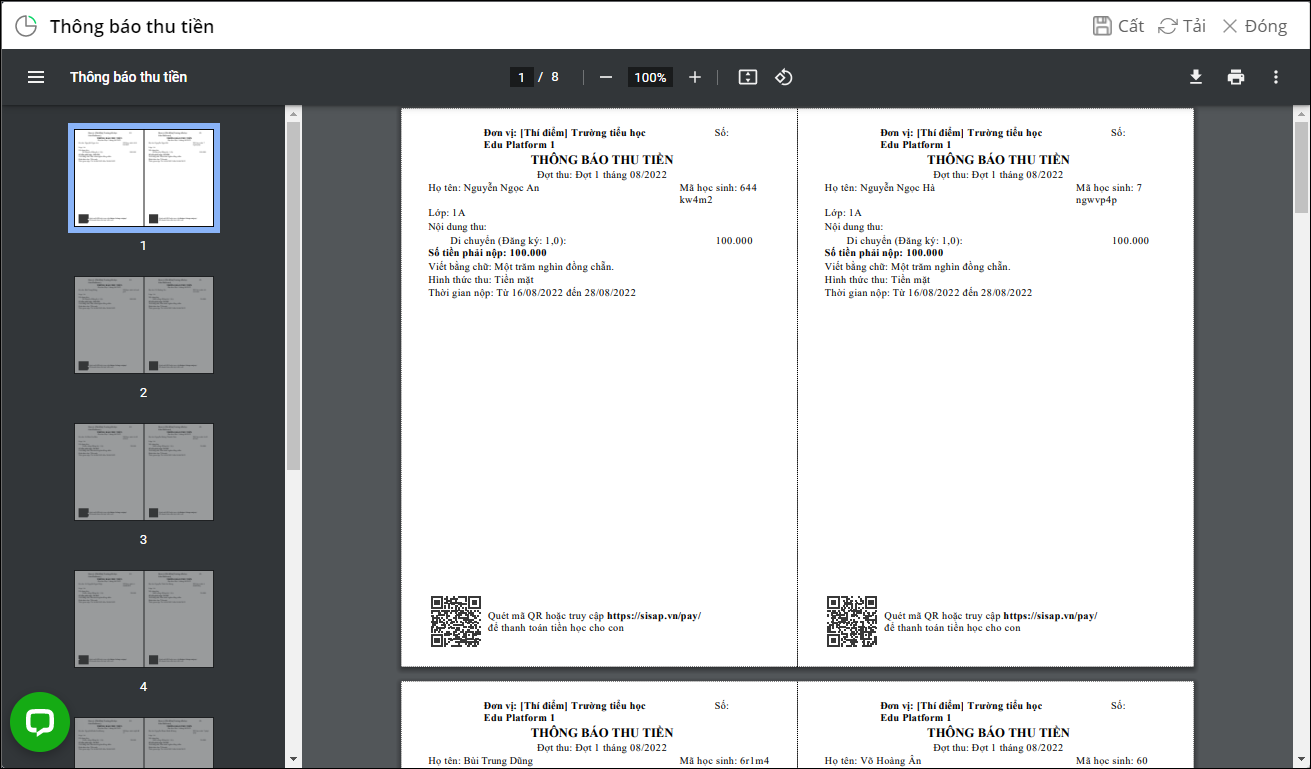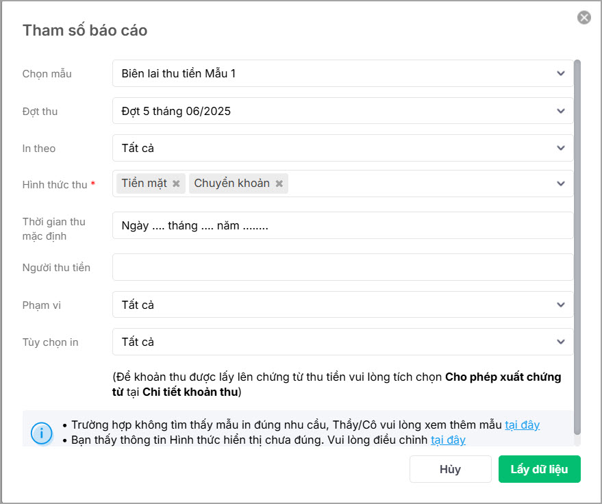 - Tùy chỉnh in (Tất cả; In chứng từ cho học sinh còn phải thu; In chứng từ cho học sinh đã thu)